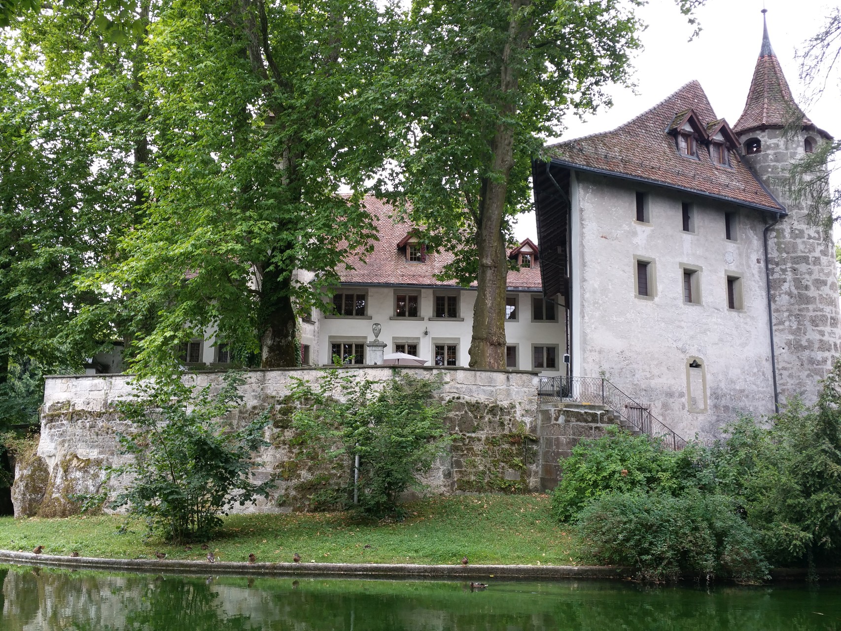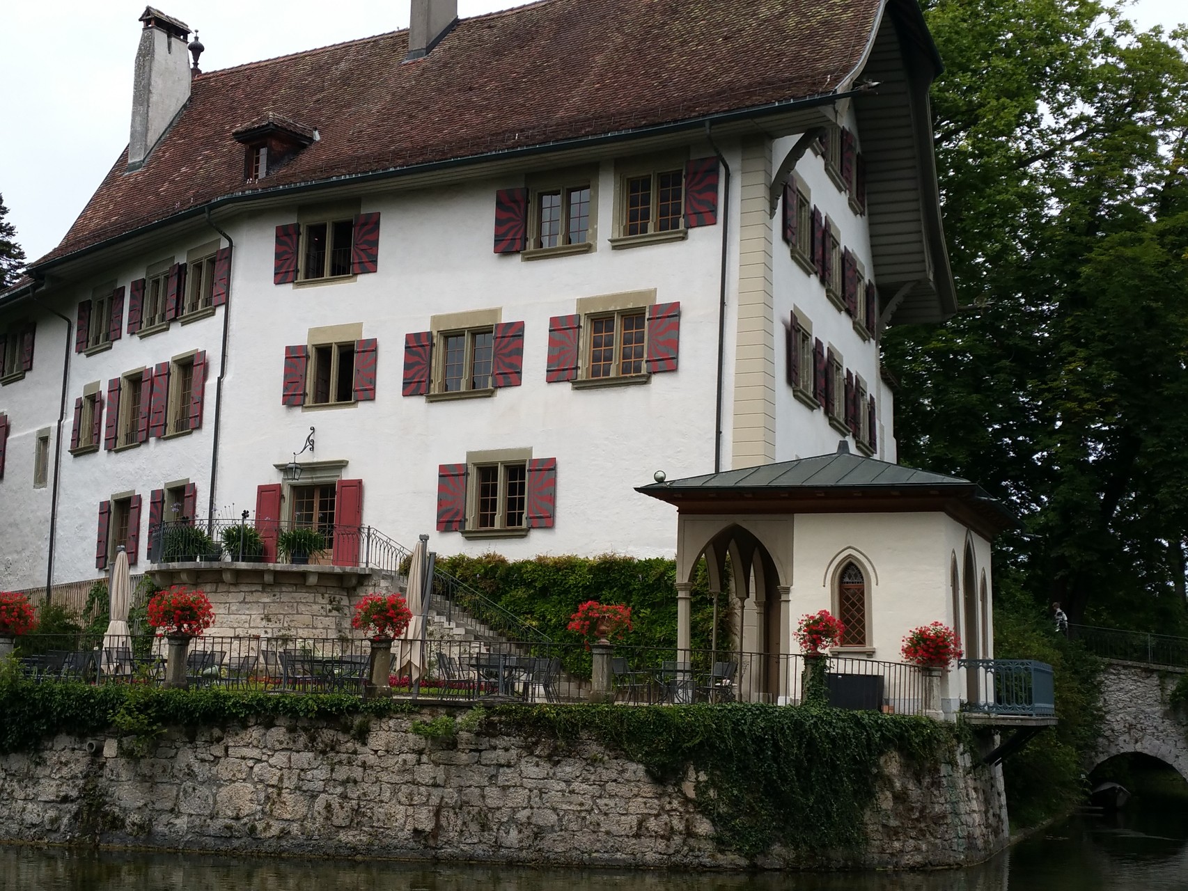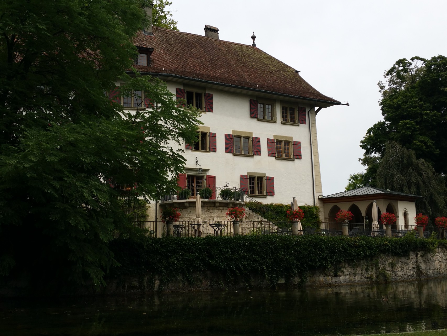Was suchen Wanderfreunde in diesen heissen Tagen? Ja natürlich, schattige Wege entlang eines Flusses. Zuerst mal eine Fahrt nach Utzenstorf. Nun wollen wir uns für die Wanderung stärken, also Suche nach einer Gaststätte. Hinter einer mit Baugerüsten verkleideten Fassade finden wir den lauschigen Garten des Restaurant Bären. Hier lässt sich gut sein und das Essen schmeckt fein. Dann heisst es auf zur Emme! Auf schönen Wegen wandern wir also dem Fluss entlang. Schloss Landshut empfängt uns mit einem wunderschönen Park, durchzogen von Bachläufen und einem verträumten, kleinen Wasserfall. Im Schlosshof gibt es eine kleine Wirtschaft, wo wir vor uns hinträumen können von vergangenen Zeiten. Weiter geht es, zuerst - leider - auf einem sonnig heissen Strassenstück, bevor wir wieder zur Emme abzweigen können. Glücklich sind wir über die schattenspendenden Bäume und Sträucher, die uns bis fast zum Bahnhof Gerlafingen begleiten. Gemäss Wanderplaner kann diese Strecke in 2 Stunden bewältigt werden. Unsere Seniorengemeinschaft aus 2 Menschen und 2 Hunden nimmt sich die Zeit, unterwegs auch stehen zu bleiben, zu staunen und zu wundern und vor Allem sich an der schönen Natur zu erfreuen.