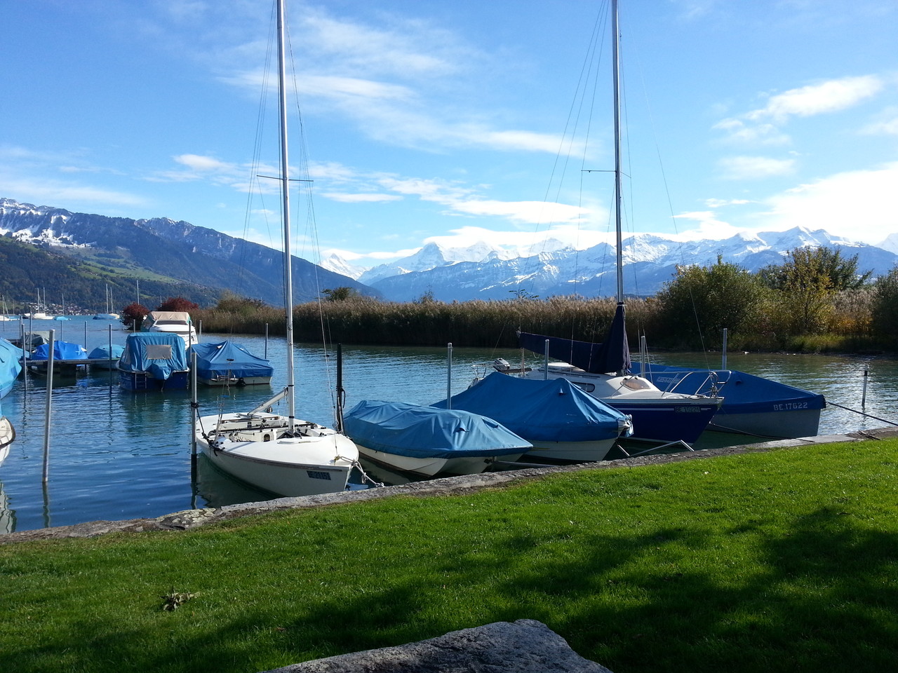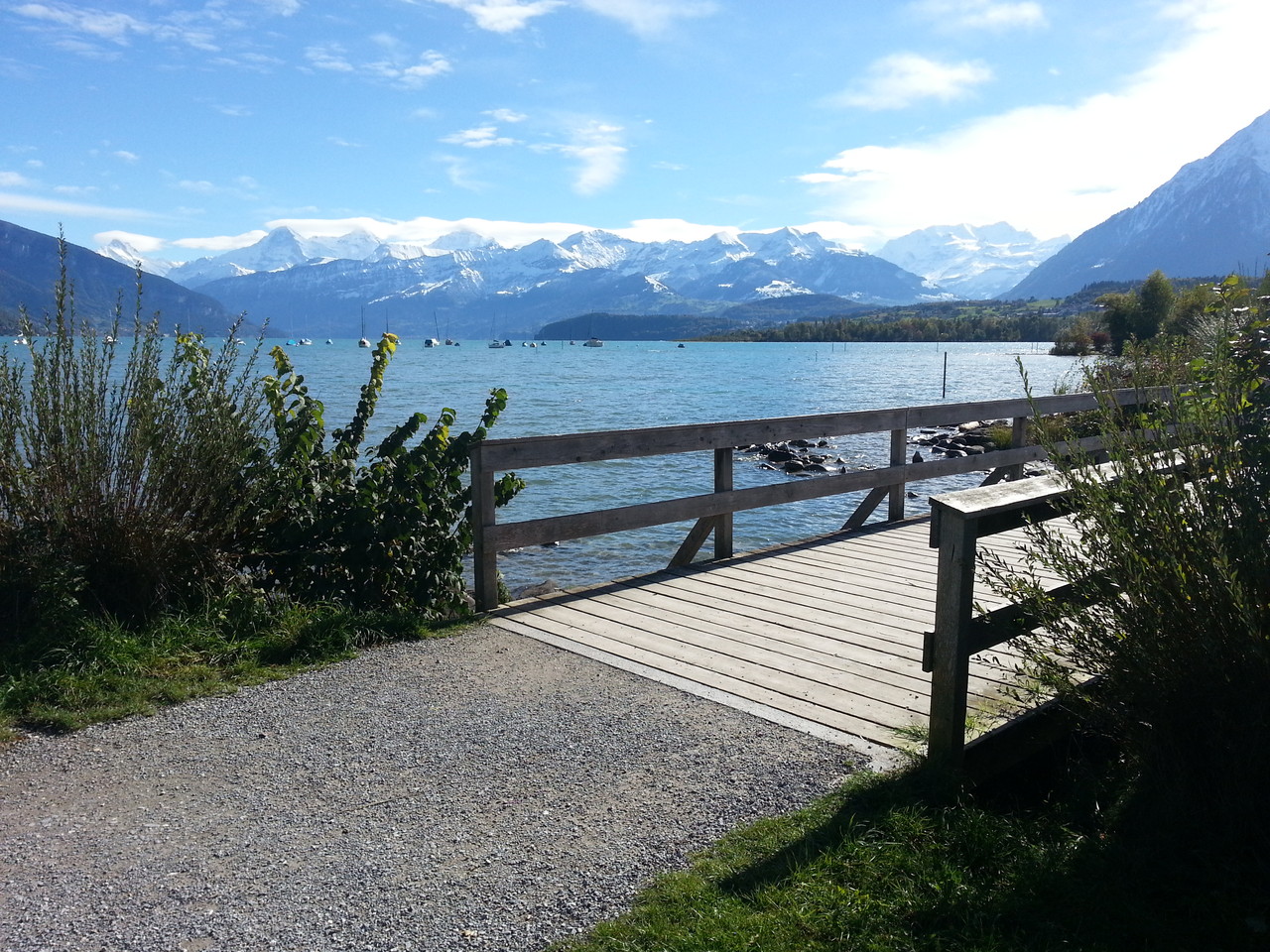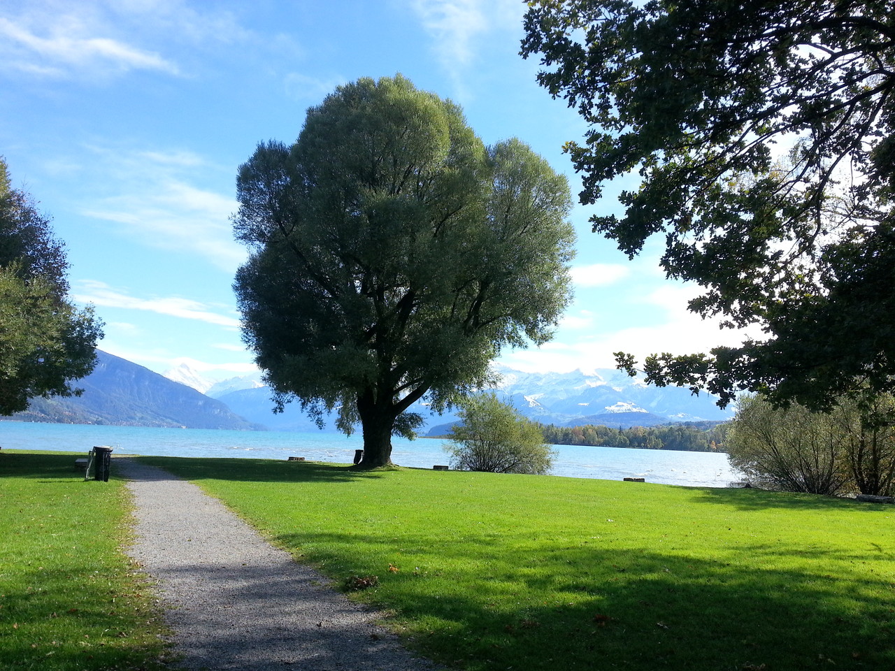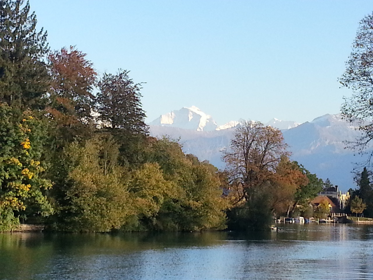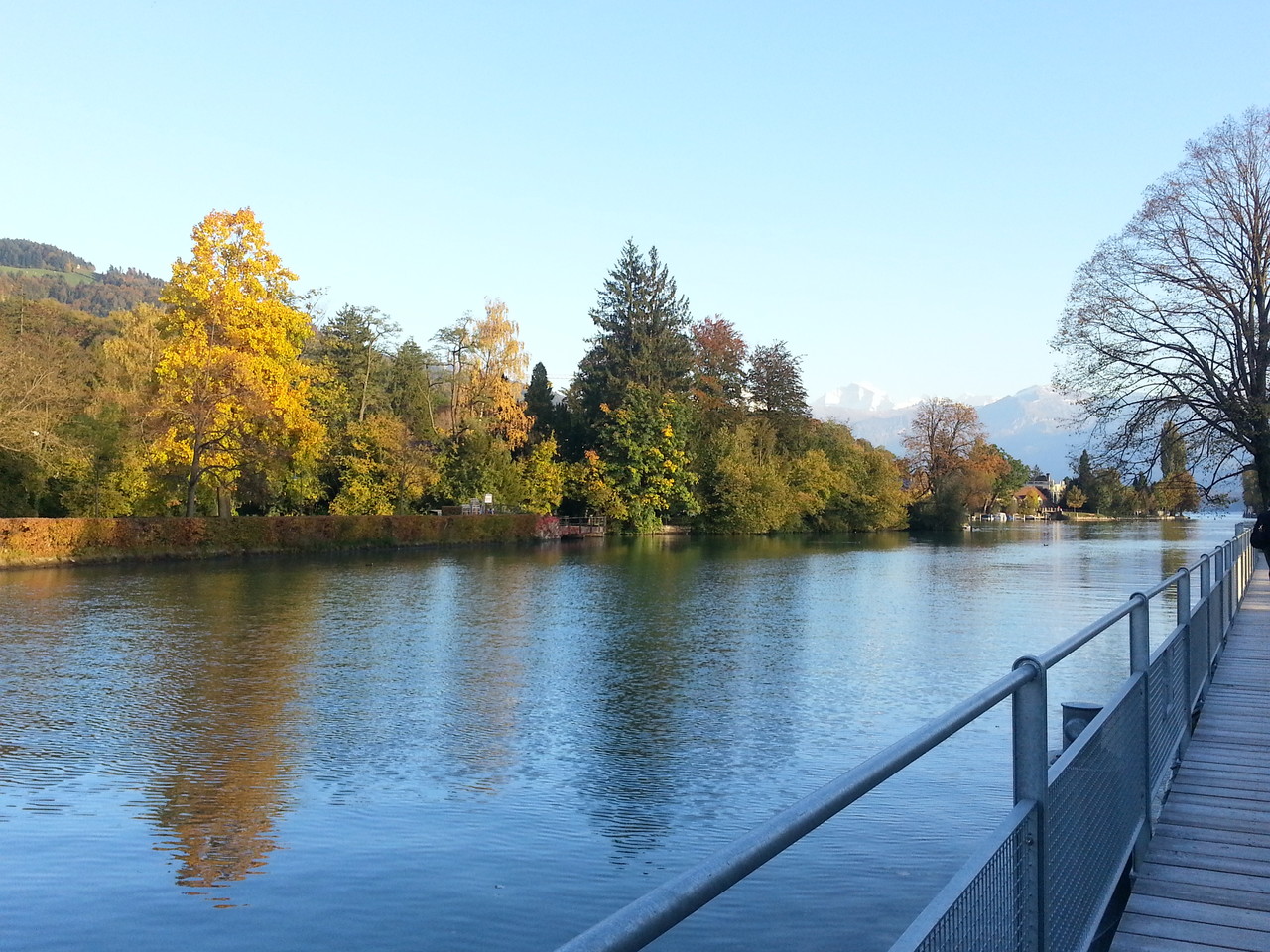 Vom Bahnhof Thun folgen wir den gelben Wanderwegweisern Richtung Hünibach. Über den Brahmsquai, erst dem Kanal entlang und dann am Ufer des Thunersees erreichen wir die Schiffländte Hünibach. Unterwegs erfreuen wir uns an den herbstlich bunten Bäumen, die sich in aller Pracht vom strahlend blauen Himmel abheben.