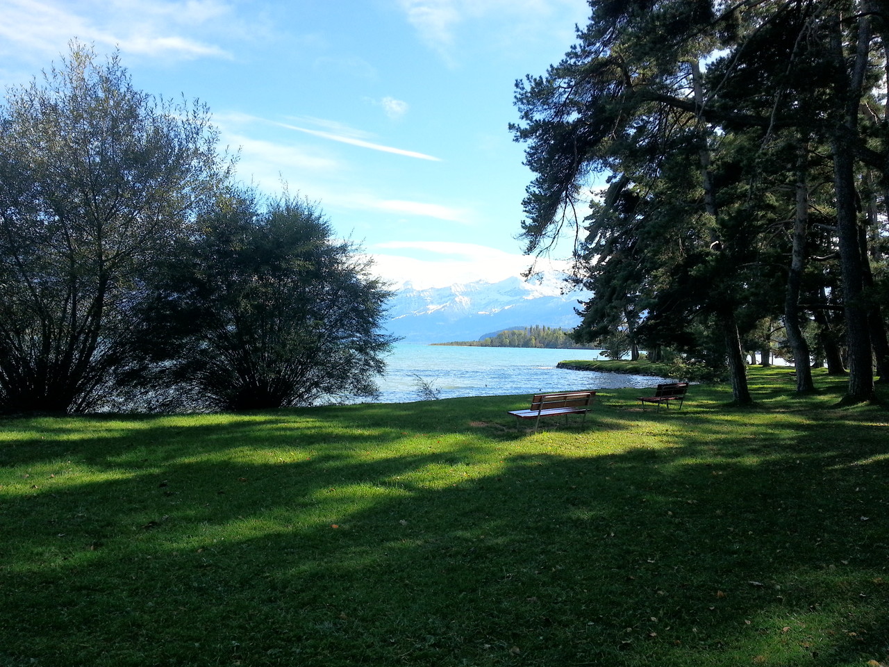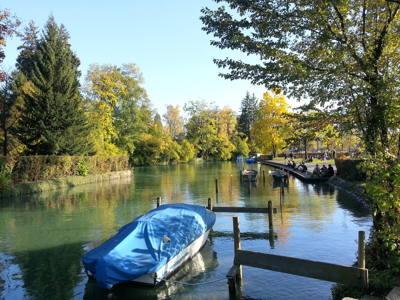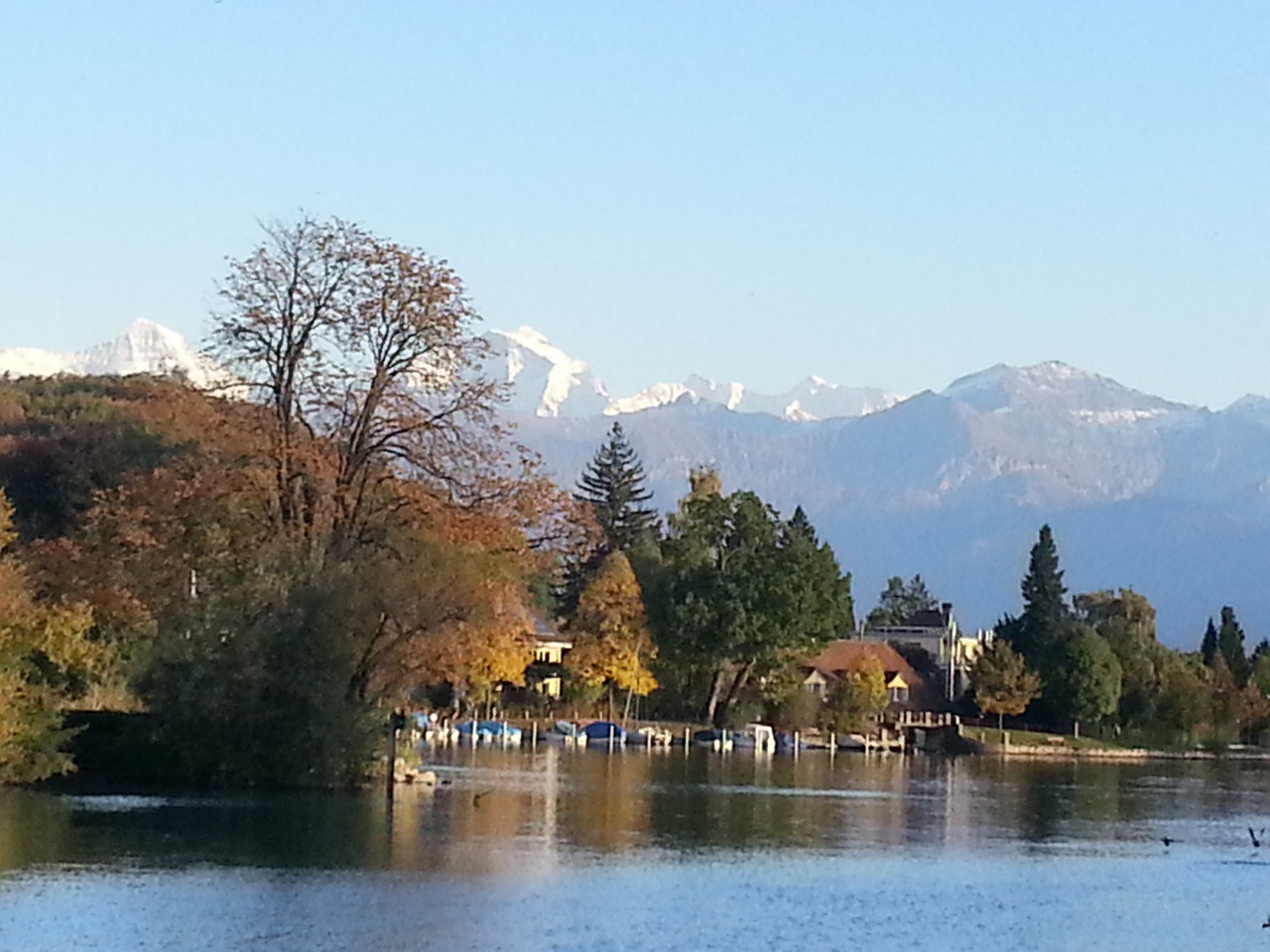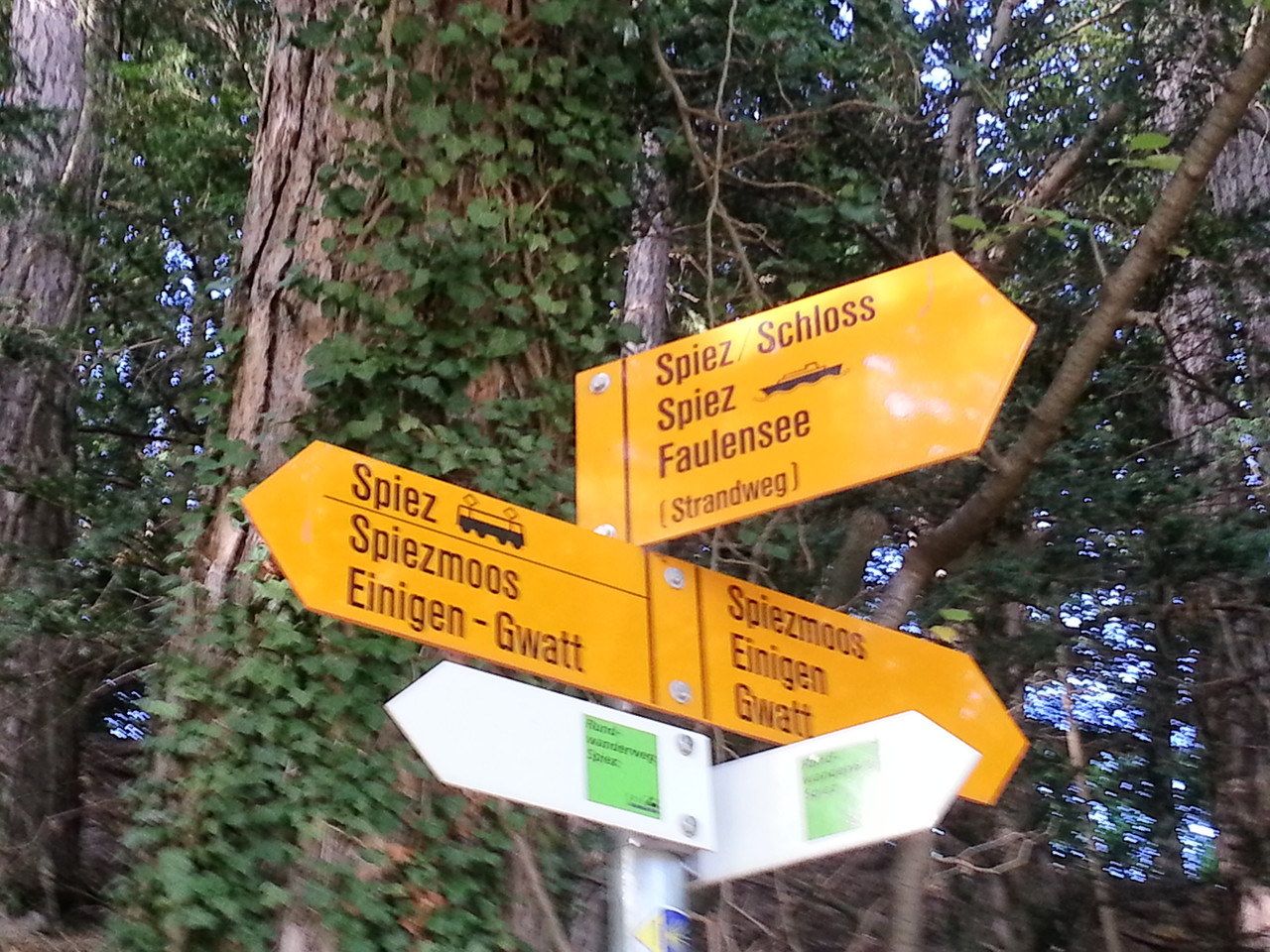Vom Bahnhof Thun folgen wir den gelben Wanderwegweisern Richtung Hünibach. Über den Brahmsquai, erst dem Kanal entlang und dann am Ufer des Thunersees erreichen wir die Schiffländte Hünibach. Unterwegs erfreuen wir uns an den herbstlich bunten Bäumen, die sich in aller Pracht vom strahlend blauen Himmel abheben.