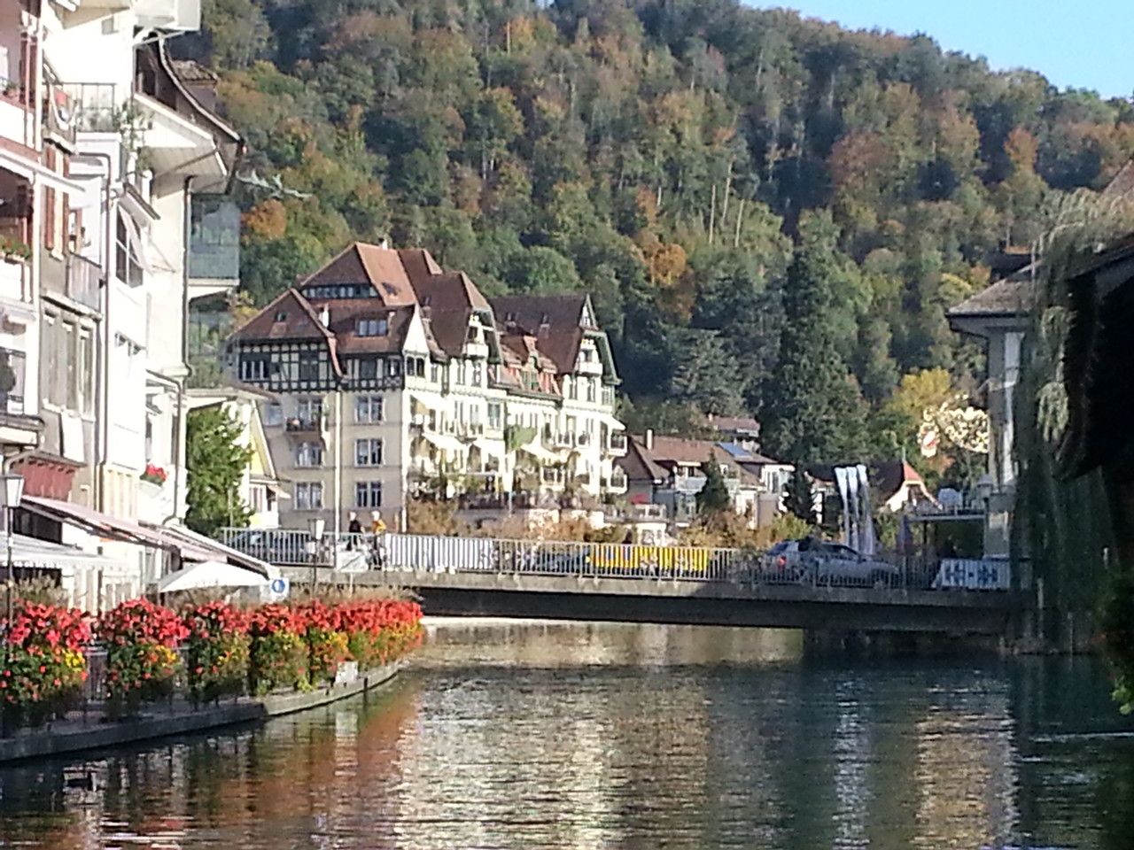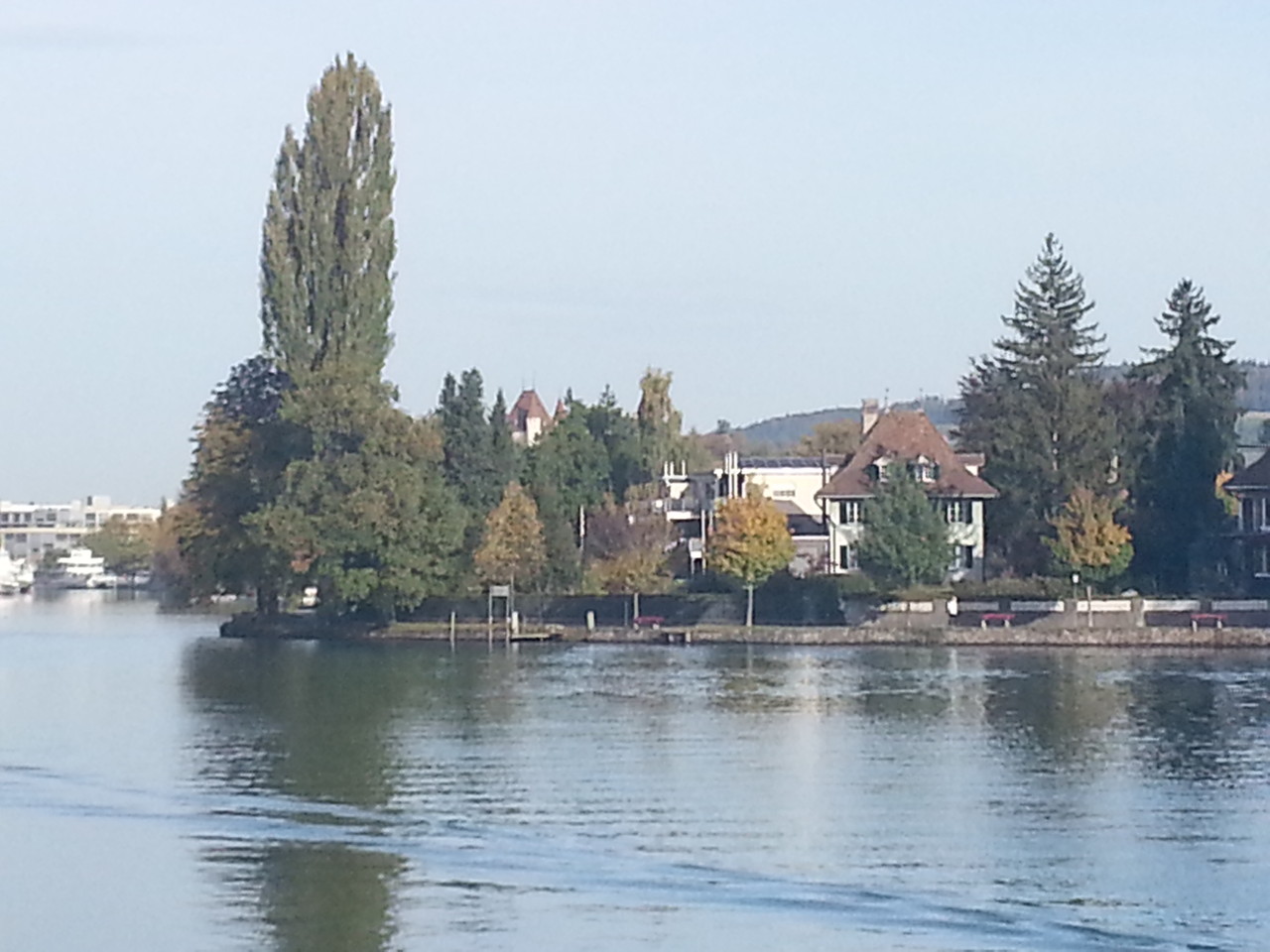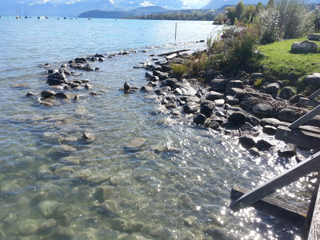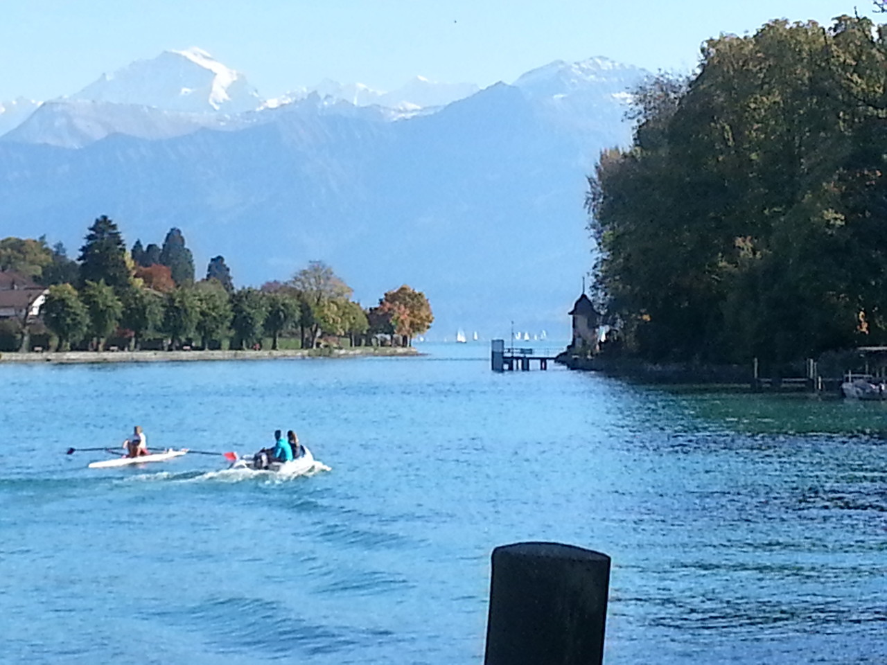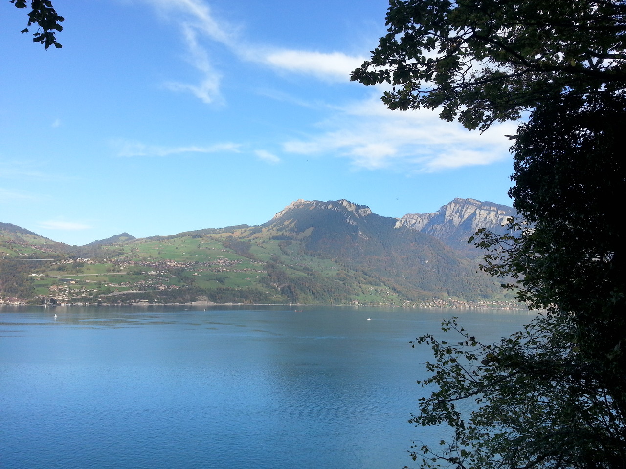 Vom Bahnhof Thun folgen wir den gelben Wanderwegweisern Richtung Hünibach. Über den Brahmsquai, erst dem Kanal entlang und dann am Ufer des Thunersees erreichen wir die Schiffländte Hünibach. Unterwegs erfreuen wir uns an den herbstlich bunten Bäumen, die sich in aller Pracht vom strahlend blauen Himmel abheben.