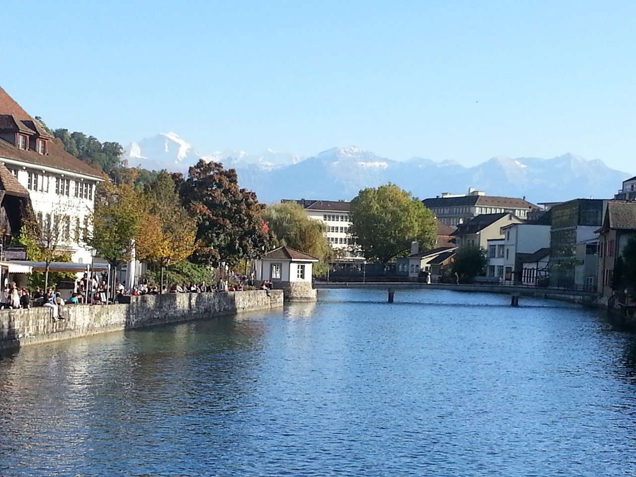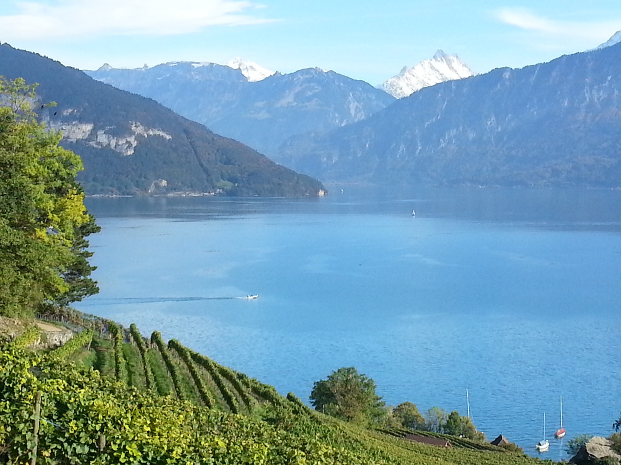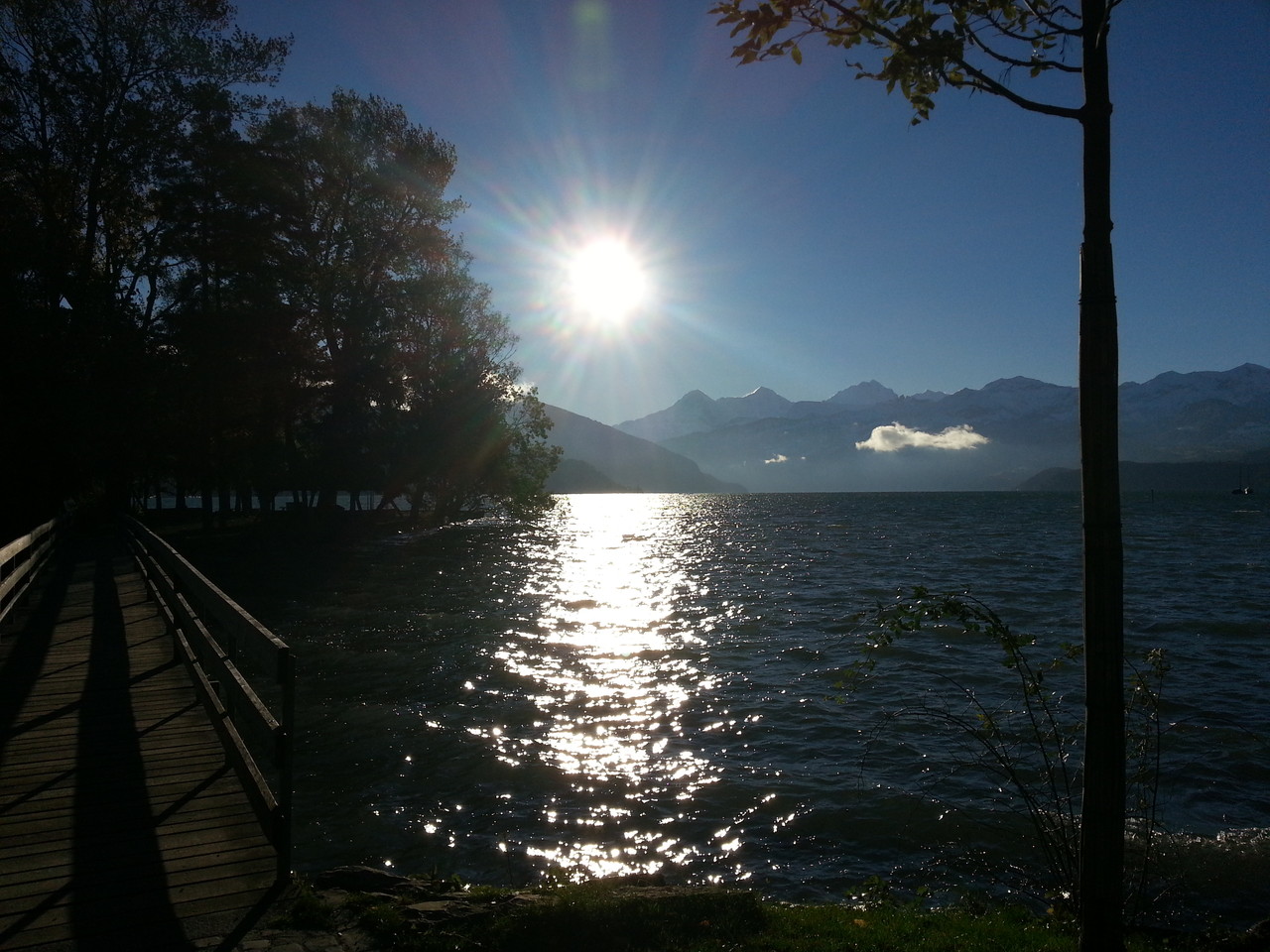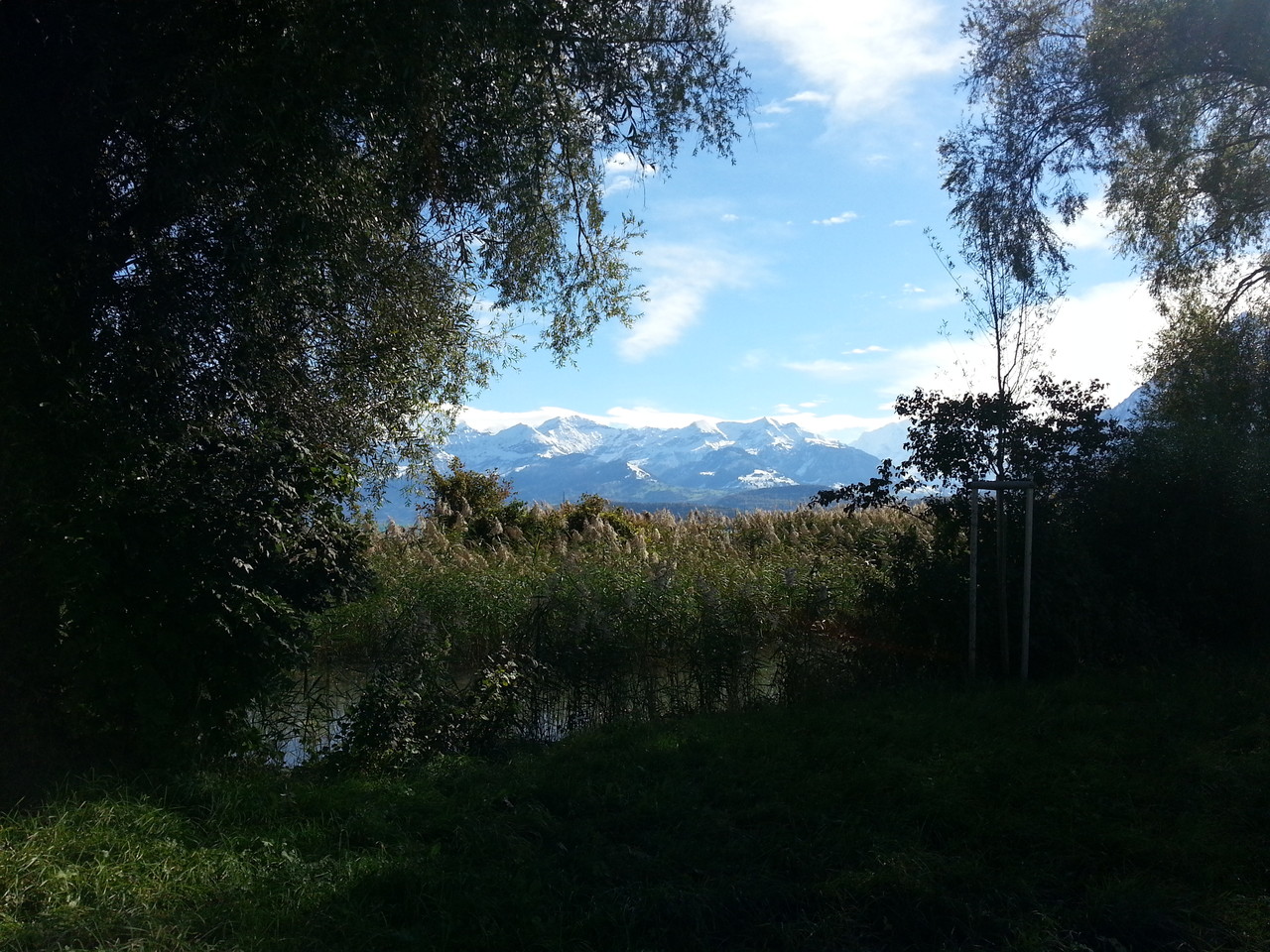 Vom Bahnhof Thun folgen wir den gelben Wanderwegweisern Richtung Hünibach. Über den Brahmsquai, erst dem Kanal entlang und dann am Ufer des Thunersees erreichen wir die Schiffländte Hünibach. Unterwegs erfreuen wir uns an den herbstlich bunten Bäumen, die sich in aller Pracht vom strahlend blauen Himmel abheben.