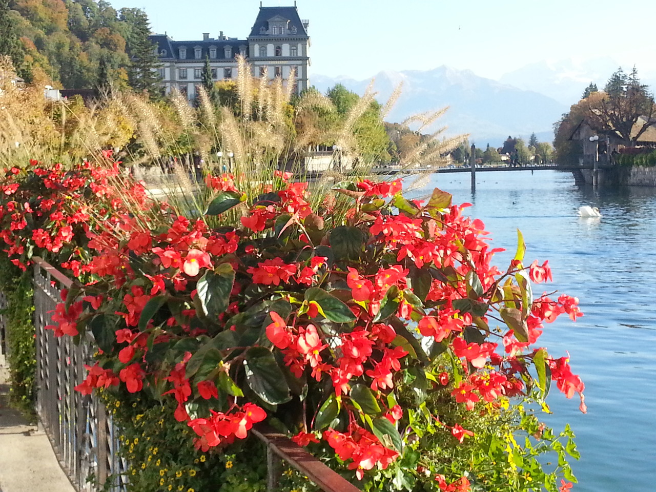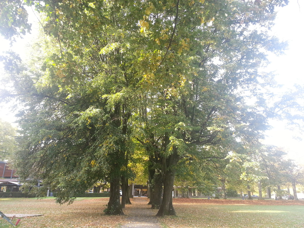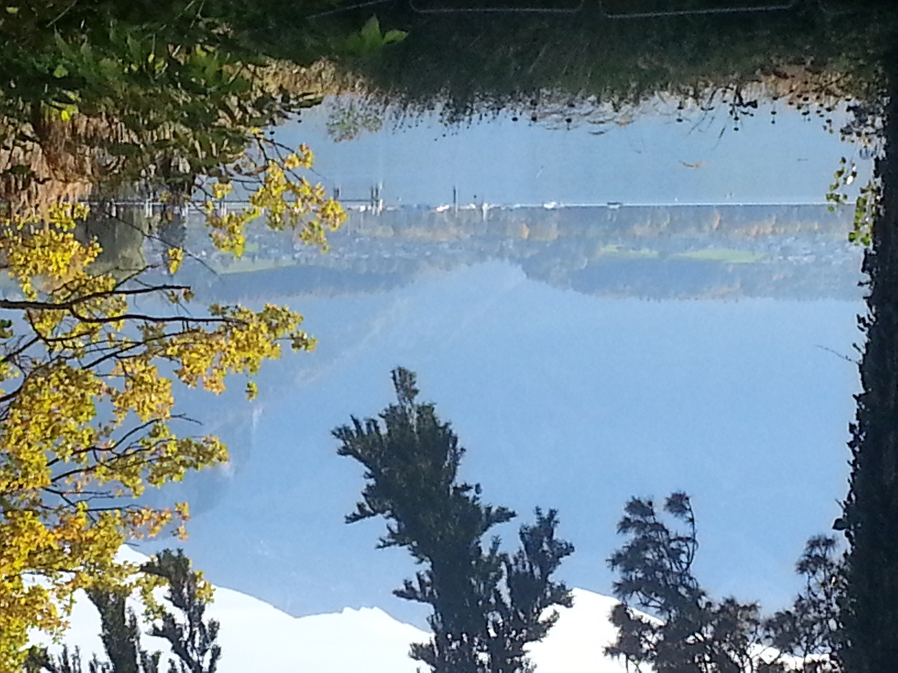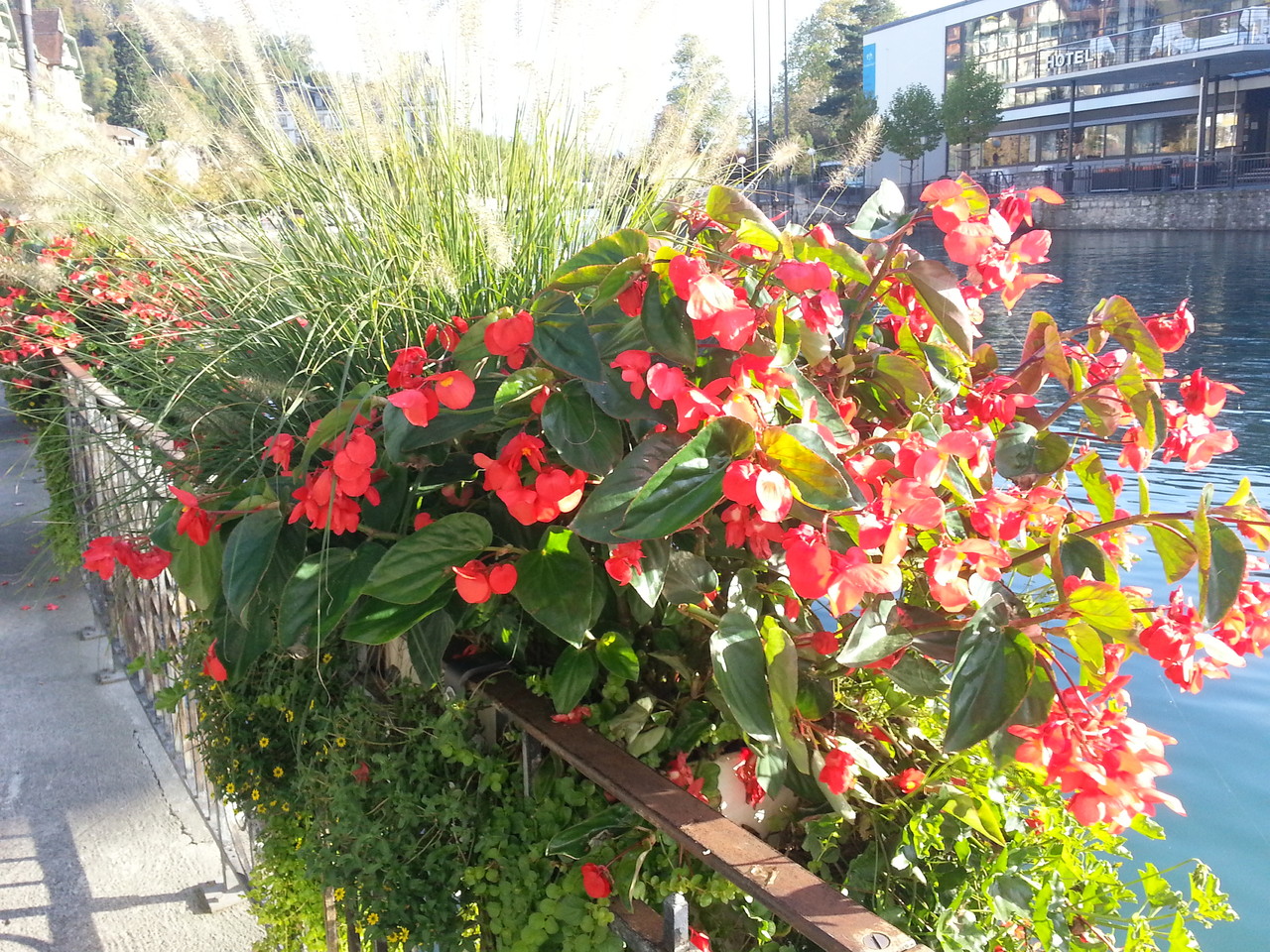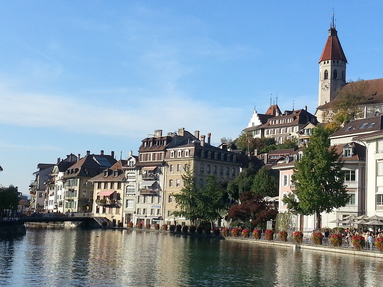 Vom Bahnhof Thun folgen wir den gelben Wanderwegweisern Richtung Hünibach. Über den Brahmsquai, erst dem Kanal entlang und dann am Ufer des Thunersees erreichen wir die Schiffländte Hünibach. Unterwegs erfreuen wir uns an den herbstlich bunten Bäumen, die sich in aller Pracht vom strahlend blauen Himmel abheben.