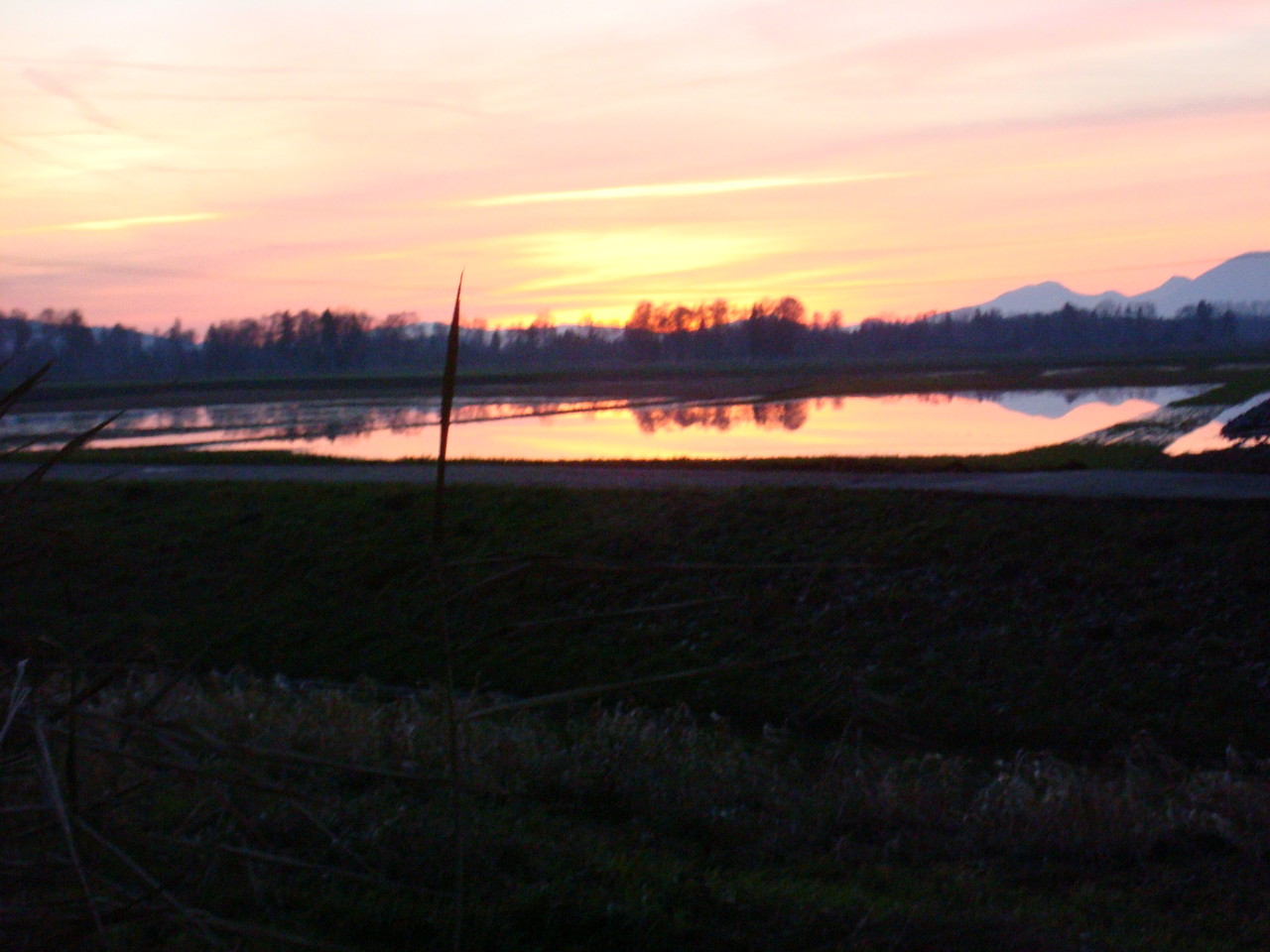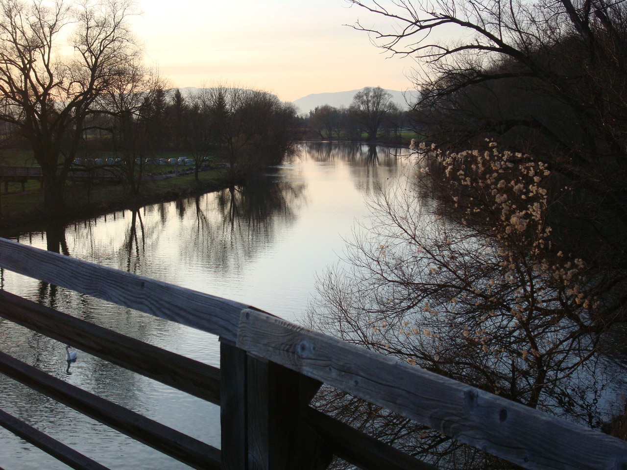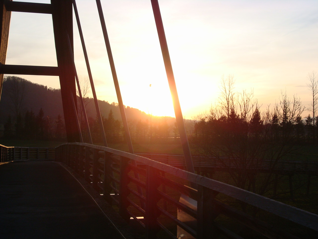 Ein Stück der Hauptstrasse entlang, fanden wir bald die Abzweigung zum Broyekanal, dem wir die nächste Stunde folgen durften. Auch hier gab es viel zu sehen. Sogar einige Yachten zuckelten gemütlich ihren Weg auf den Kanal und die Leute darauf freuten sich offensichtlich genau wie wir über diesen wunderschönen, letzten Tag im Jahr. Um 17.30 Uhr erreichten wir eine interessante Brücke über den Kanal und freuten uns unendlich am farbenprächtigen, allerletzten Sonnenuntergang des Jahres 2012. Weiter ging es auf einem schnurgeraden Weg durch den Wald. Am Ende des Walden durften wir uns nochmals an den tollen Farben des Himmels freuen, ehe der Tag ganz langsam in den Abend überging.