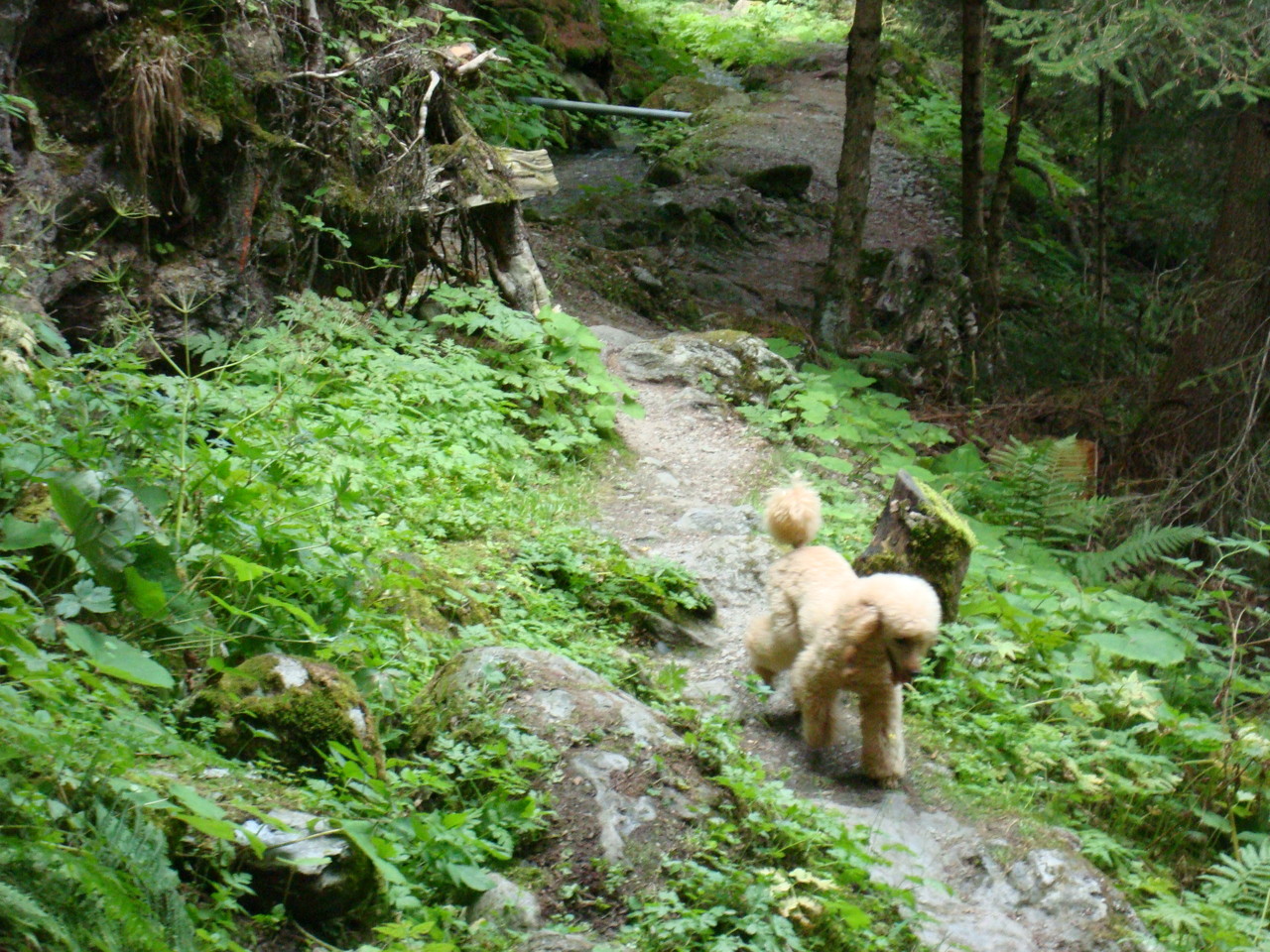 Bald geht es los Richtung Seilbahn, was erst einmal einen Aufstieg von 20 Min zur Folge hat. Eigentlich mag ich selber bergauf laufen nicht speziell, Agnes aber läuft wie ein Wiesel. Oben angekommen suchen wir den Weg nach Planchouet, der Bisse Vieux entlang. Der Weg ist wunderschön, schattig und das leise Murmels des Wassers in der Bisse singt uns ein Lied von alten Zeiten. Nach 2 Stunden finden wir eine kleine Gaststätte, wo wir uns stärken können, bevor wir den Rückweg antreten. Schön ist es hier, die Tische stehen teilweise im Gras, sodass Monty und Holy schön Platz zu erholen haben. Nach der Rast geht es weiter über Panchouet, der Bisse du Milieu entlang zurück nach Haute Nendaz.
