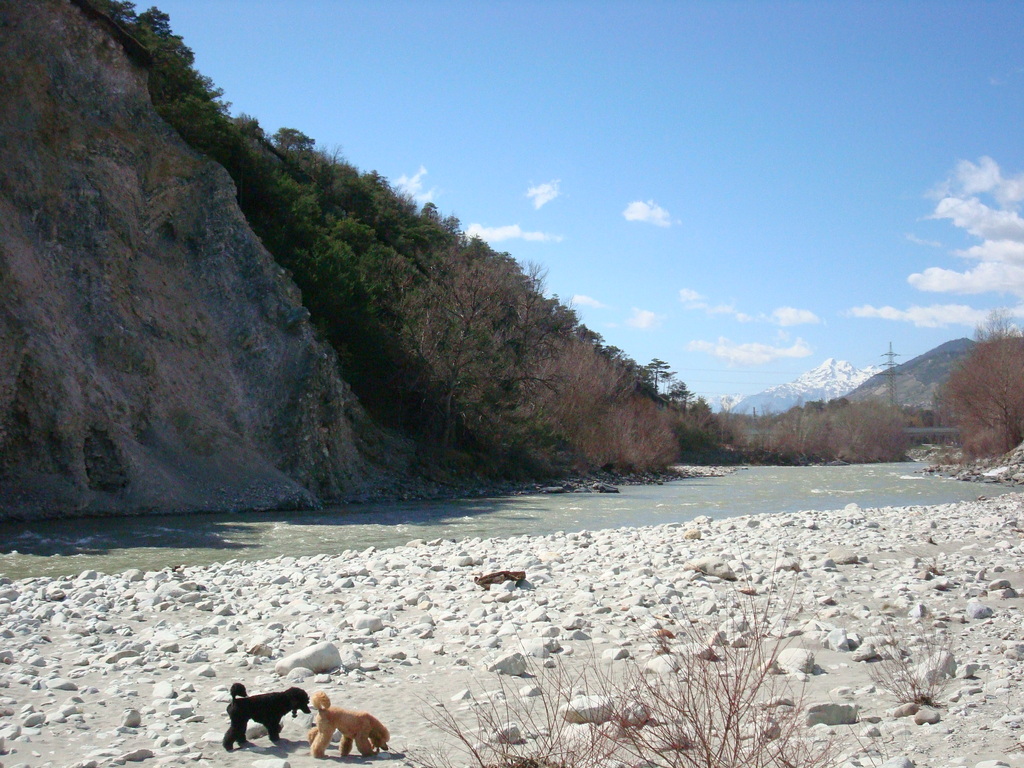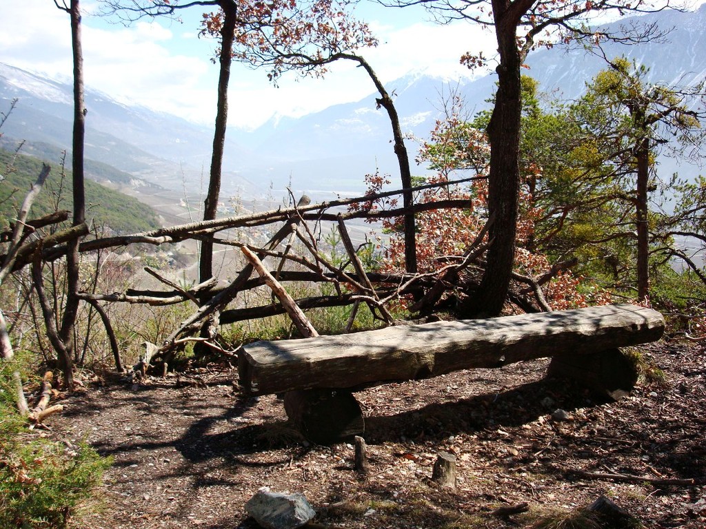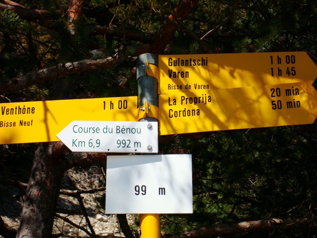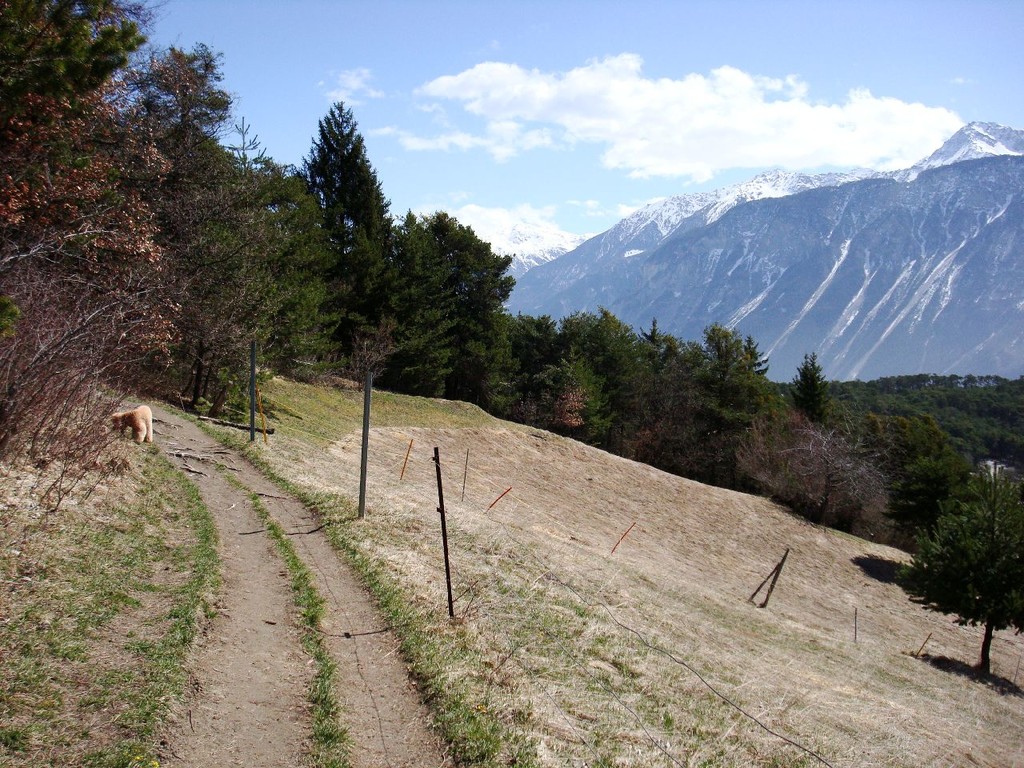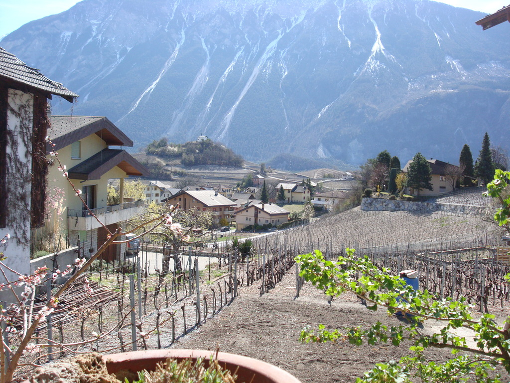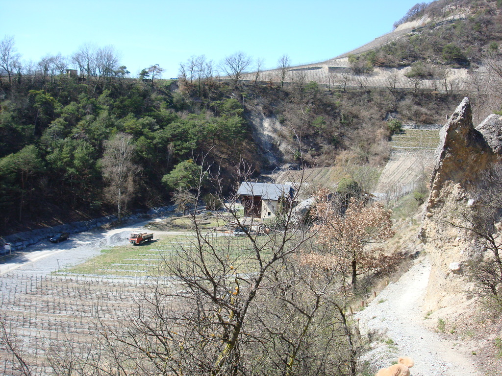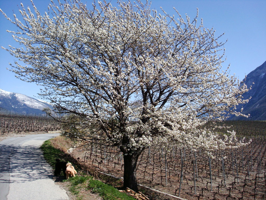 In Sierre angekommen, orientierien wir uns an den gelben Wanderwegweisern vor dem Bahnhof. Dann geht es los geradeaus bis zur Querstrasse und dann nach links, wo wir Ausschau halten nach der Station des Funicolairs. Dieses bringt uns nach Venthône (Abfahrt im Moment .15 und .45 Uhr). Zu Fuss wäre der Aufstieg in 1 Stunde zu bewältigen (810 m ü.M.) Von der Station des Funi wandern wir in zirka 15 Minuten ins Dorf. Der alte Dorfkern mit der Kirche auf einem Felsvorsprung ist sehenswert. Gestärkt mit einem Kaffe für mich und Wasser mit Kaffeerahm für meine drei Pudelbegleiter nehmen wir die Wanderung über die "Grosse Wasserleitu von Varen - Bisse Neuf (3 Std.) in Angriff. Da unsere Herzen weit geöffnet und die Augen staunend auf die Gaben der Natur gerichtet sind, brauchen wir immer etwas mehr Zeit. Begleitet werden wir vom Gesang der Vögel, die voller Lebensfreude ihre Frühlingslieder in die laue, sonnengeschwängerte Luft schmettern. Hin und wieder rauscht ein Bergbach talwärts und trägt unsere Gedanken mit sich fort in weite Fernen.