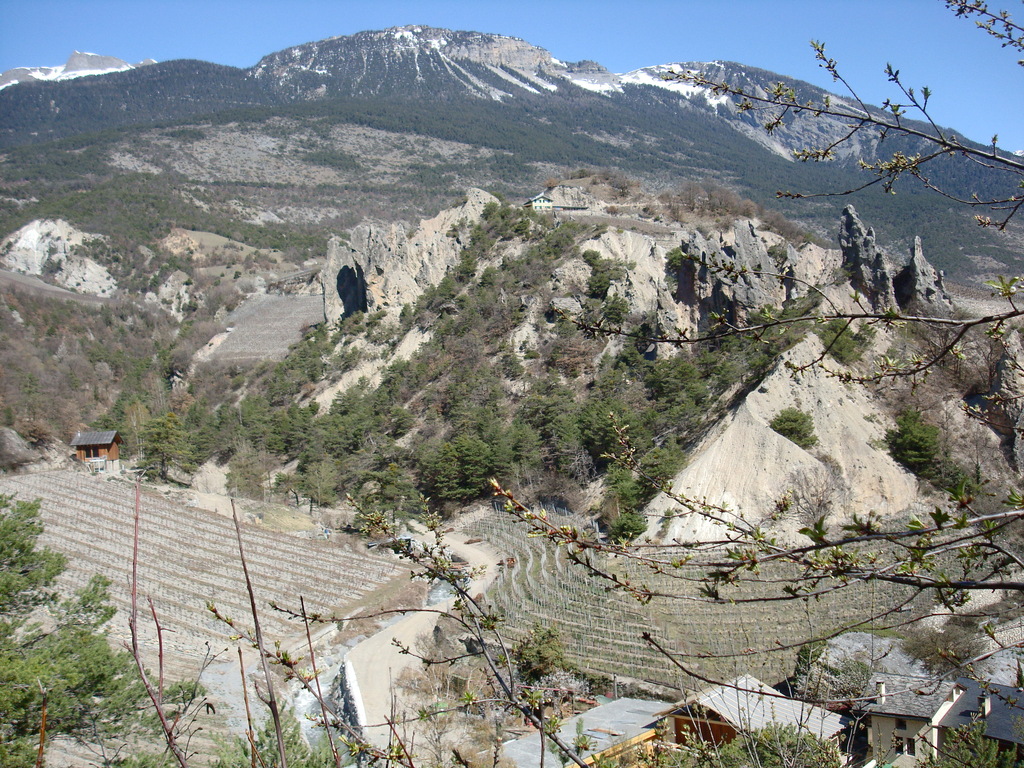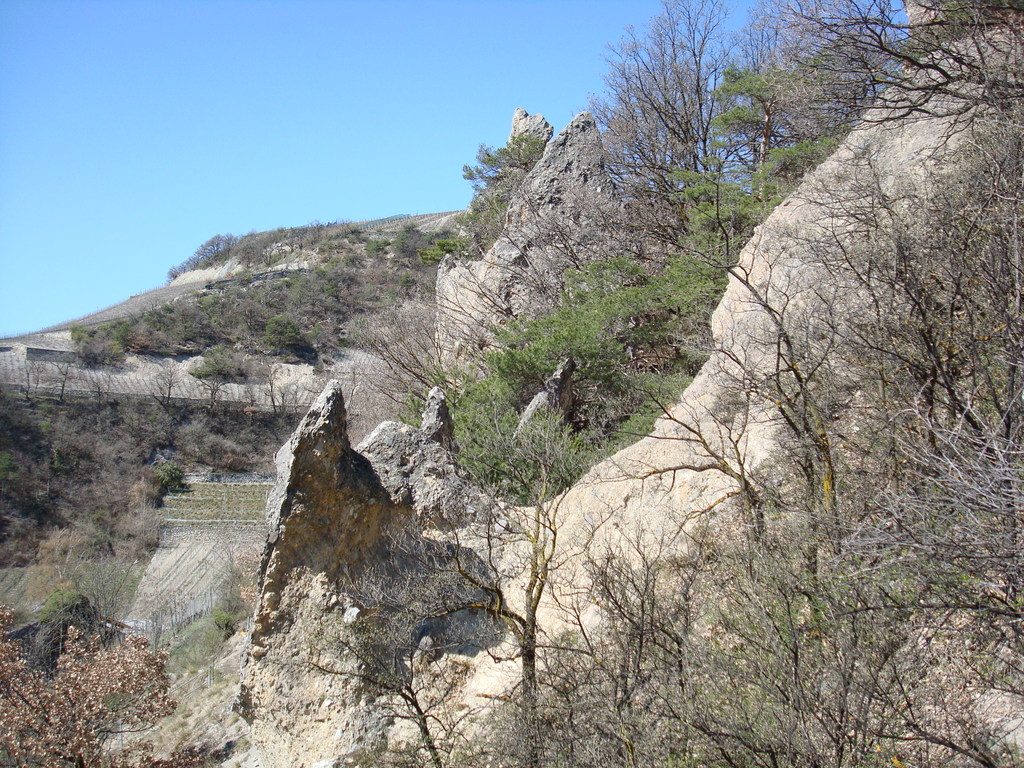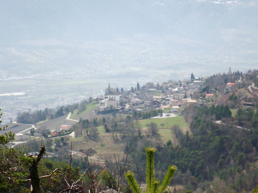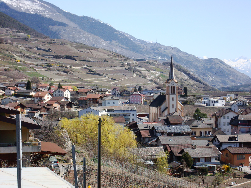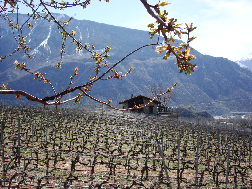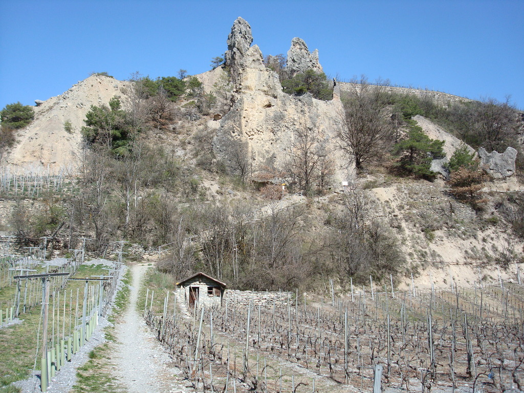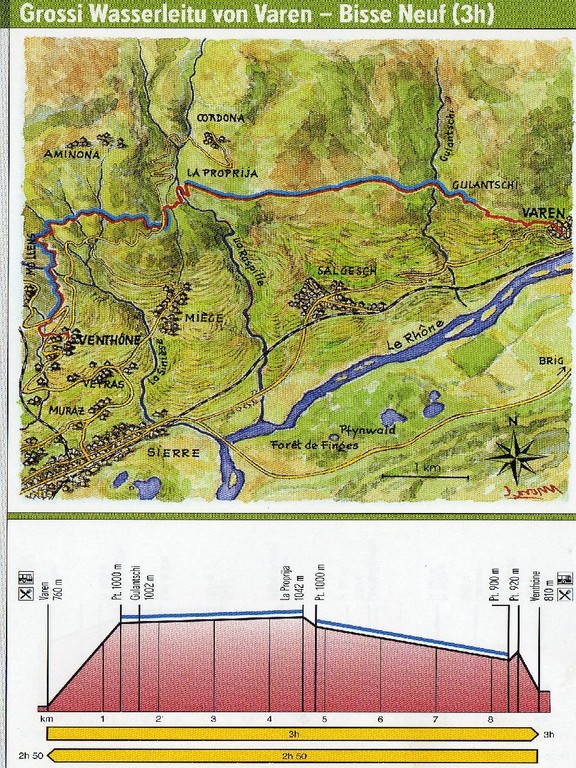 In Sierre angekommen, orientierien wir uns an den gelben Wanderwegweisern vor dem Bahnhof. Dann geht es los geradeaus bis zur Querstrasse und dann nach links, wo wir Ausschau halten nach der Station des Funicolairs. Dieses bringt uns nach Venthône (Abfahrt im Moment .15 und .45 Uhr). Zu Fuss wäre der Aufstieg in 1 Stunde zu bewältigen (810 m ü.M.) Von der Station des Funi wandern wir in zirka 15 Minuten ins Dorf. Der alte Dorfkern mit der Kirche auf einem Felsvorsprung ist sehenswert. Gestärkt mit einem Kaffe für mich und Wasser mit Kaffeerahm für meine drei Pudelbegleiter nehmen wir die Wanderung über die "Grosse Wasserleitu von Varen - Bisse Neuf (3 Std.) in Angriff. Da unsere Herzen weit geöffnet und die Augen staunend auf die Gaben der Natur gerichtet sind, brauchen wir immer etwas mehr Zeit. Begleitet werden wir vom Gesang der Vögel, die voller Lebensfreude ihre Frühlingslieder in die laue, sonnengeschwängerte Luft schmettern. Hin und wieder rauscht ein Bergbach talwärts und trägt unsere Gedanken mit sich fort in weite Fernen.