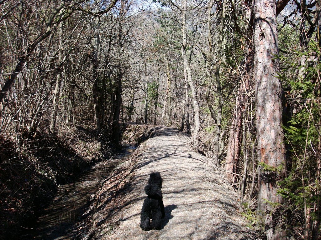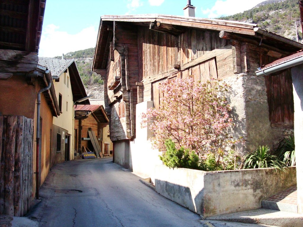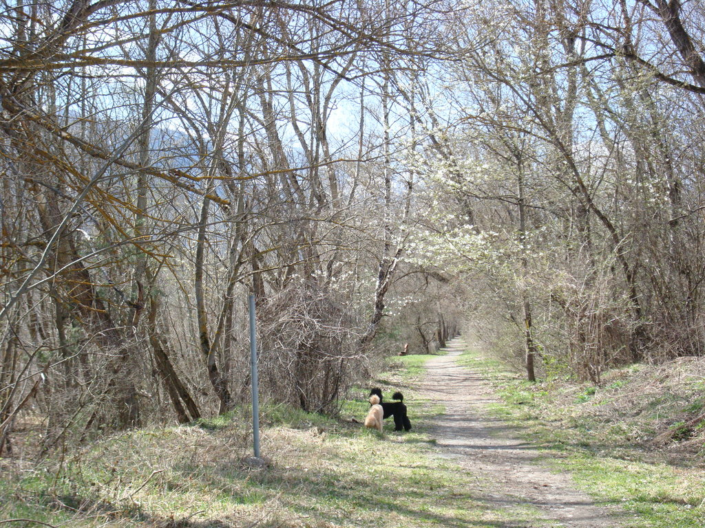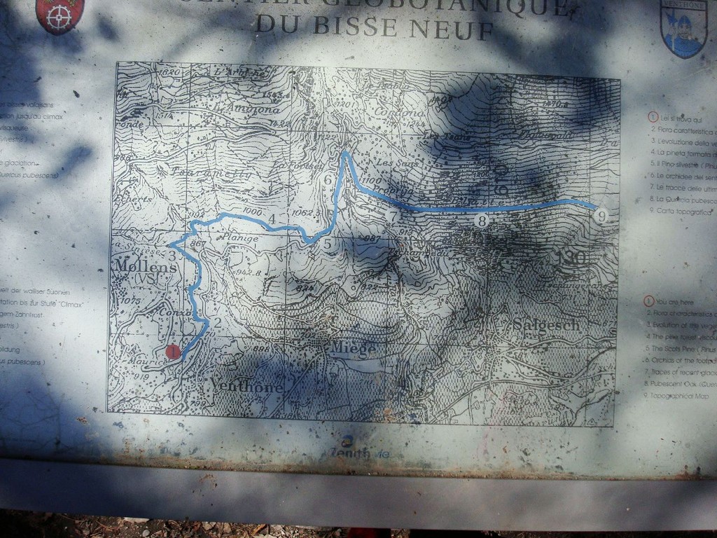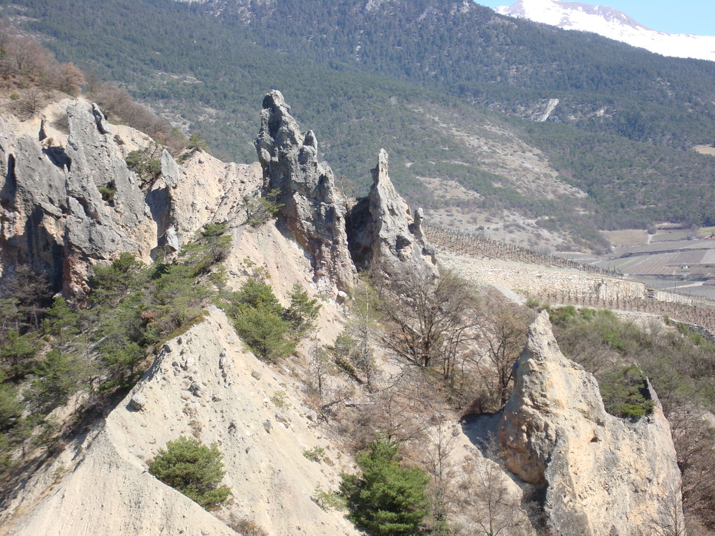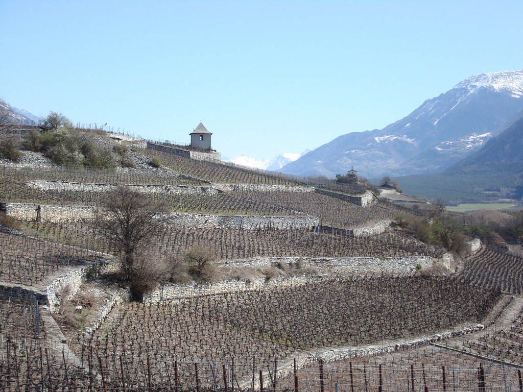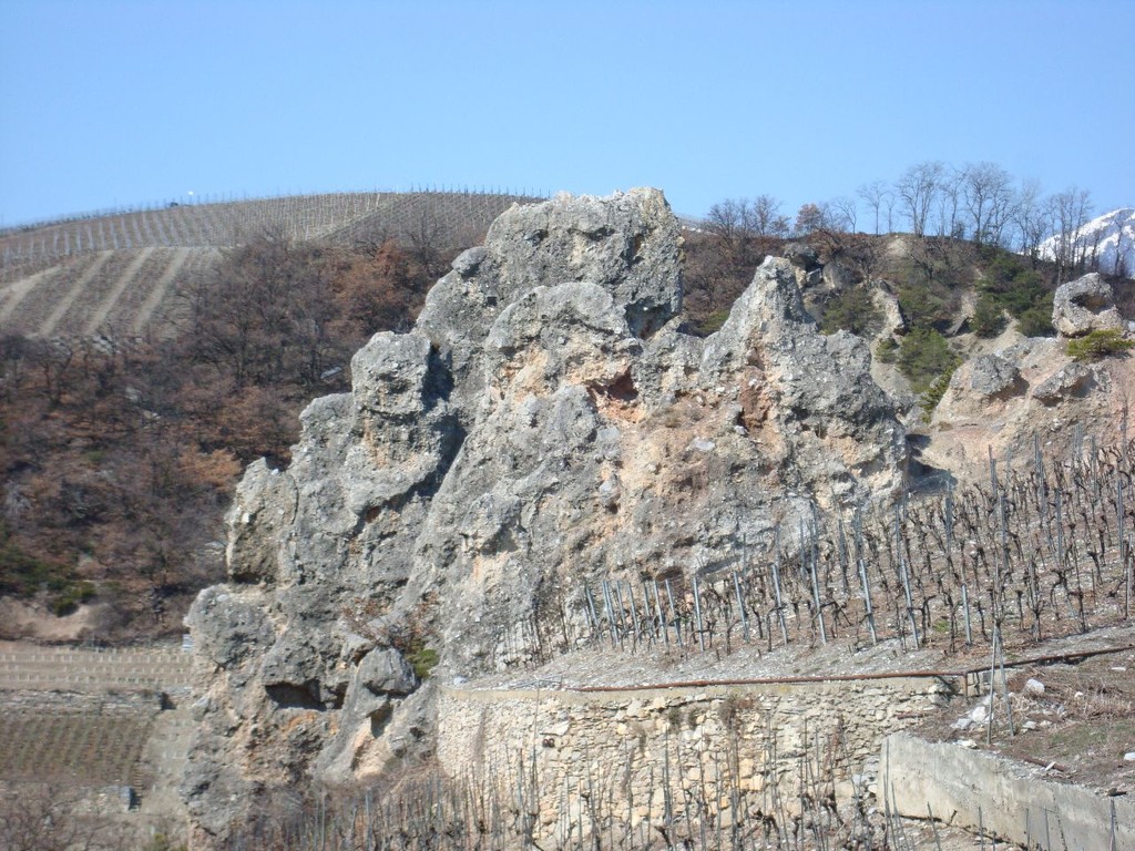 In Sierre angekommen, orientierien wir uns an den gelben Wanderwegweisern vor dem Bahnhof. Dann geht es los geradeaus bis zur Querstrasse und dann nach links, wo wir Ausschau halten nach der Station des Funicolairs. Dieses bringt uns nach Venthône (Abfahrt im Moment .15 und .45 Uhr). Zu Fuss wäre der Aufstieg in 1 Stunde zu bewältigen (810 m ü.M.) Von der Station des Funi wandern wir in zirka 15 Minuten ins Dorf. Der alte Dorfkern mit der Kirche auf einem Felsvorsprung ist sehenswert. Gestärkt mit einem Kaffe für mich und Wasser mit Kaffeerahm für meine drei Pudelbegleiter nehmen wir die Wanderung über die "Grosse Wasserleitu von Varen - Bisse Neuf (3 Std.) in Angriff. Da unsere Herzen weit geöffnet und die Augen staunend auf die Gaben der Natur gerichtet sind, brauchen wir immer etwas mehr Zeit. Begleitet werden wir vom Gesang der Vögel, die voller Lebensfreude ihre Frühlingslieder in die laue, sonnengeschwängerte Luft schmettern. Hin und wieder rauscht ein Bergbach talwärts und trägt unsere Gedanken mit sich fort in weite Fernen.