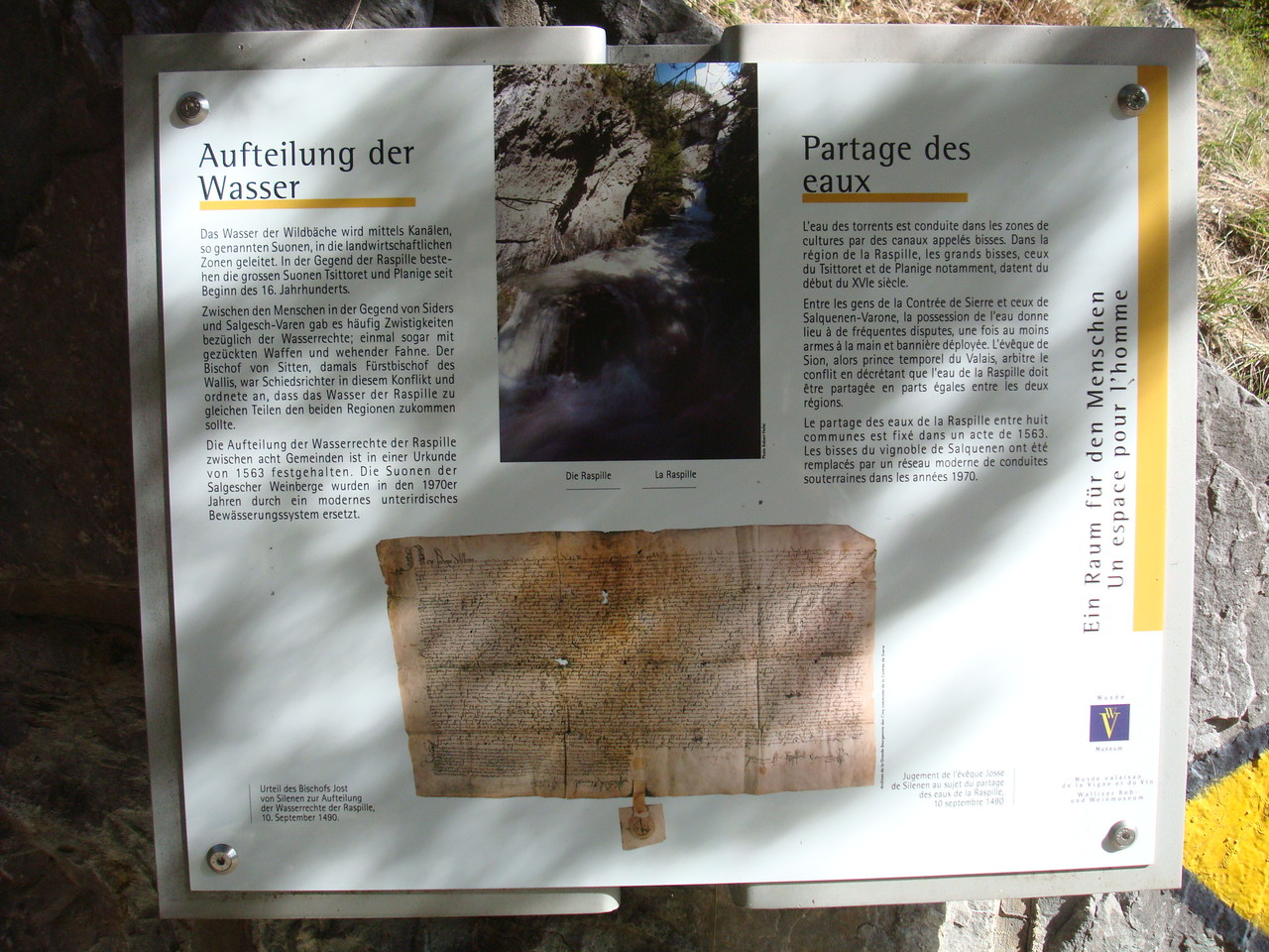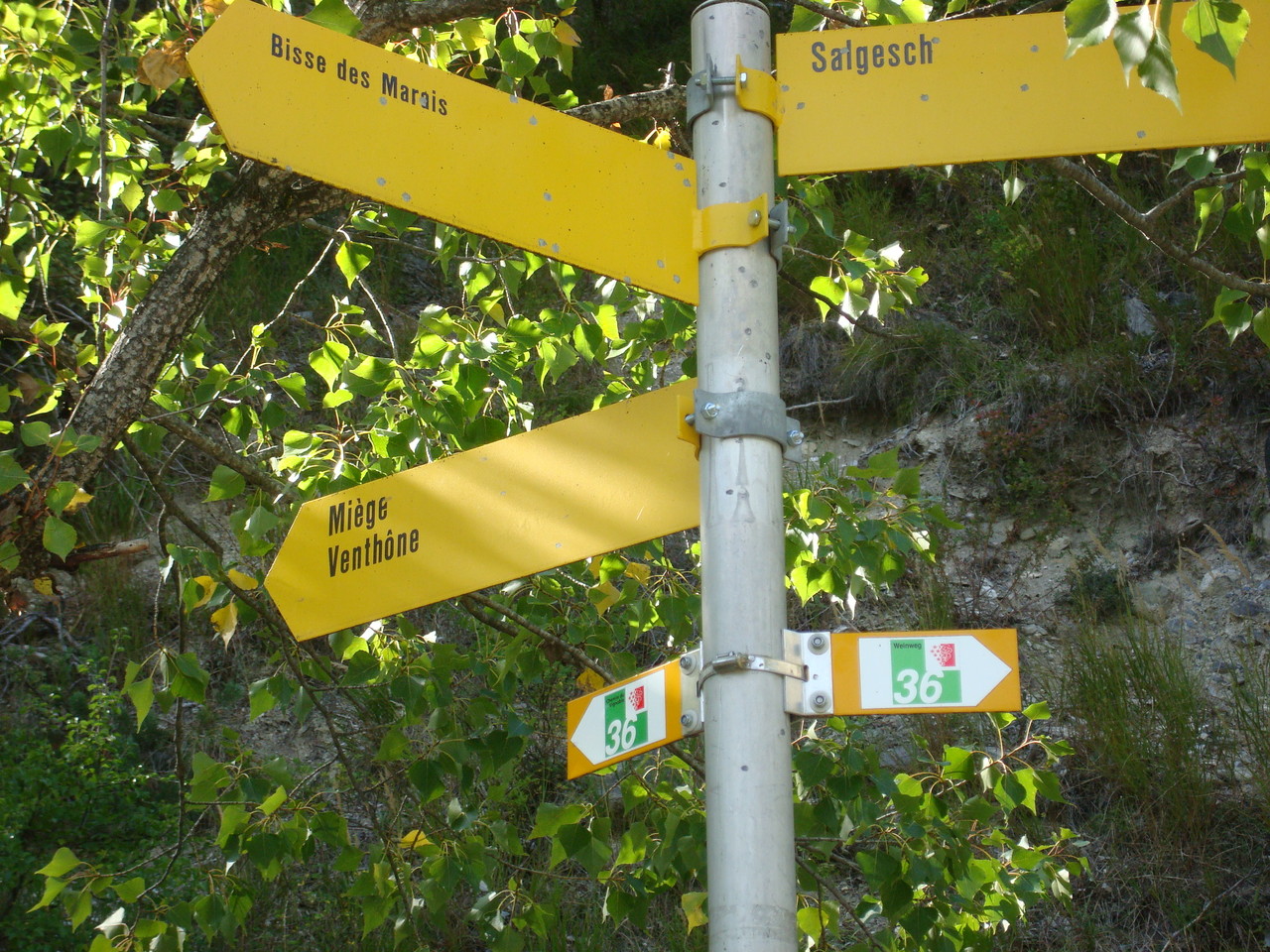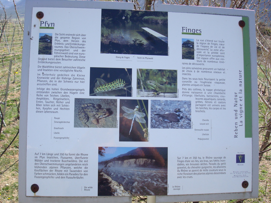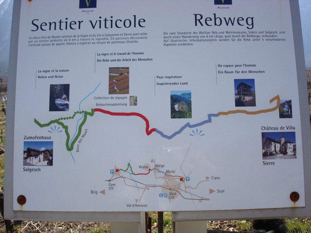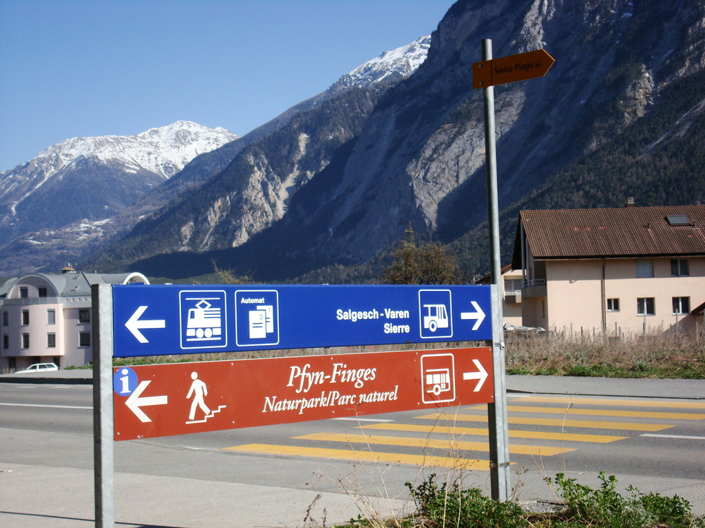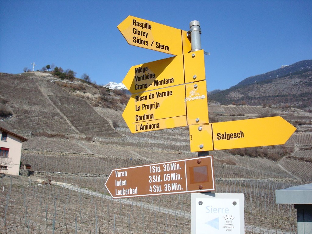 Wieder einmal sind wir in Salgesch aus dem Zug gestiegen. Vom Bahnhof ging es nach Salgesch Dorf und dort, wo alle Wanderwegweiser nach links zeigen, sind wir erst nach rechts und etwas weiter oben nach links in die Rebberge abgebogen. Durch die Rebberge wanderten wir weiter bis zu den Pyramiden über der Schlucht der Raspille. Über die kleine Brücke führte der Weg dann nach oben bis zur Abzweigung nach Glarey, einem Vorort von Sierre. Hier war das Rätselraten gross, wo nur finden wir den Weg zum Campingplatz Swiss Page. Nach einigen Irrungen und Wirrungen haben wir den richtigen Weg doch noch gefunden und durften uns über einen schönen Weg entlang der Rhone/Rotte freuen. Es hat uns so gut gefallen, dass wir am folgenden Tag diesen Rhoneweg noch einmal in umgekehrter Richtung unter die Füsse nahmen. Die Bilder zeigen wohl, wie schön es war.