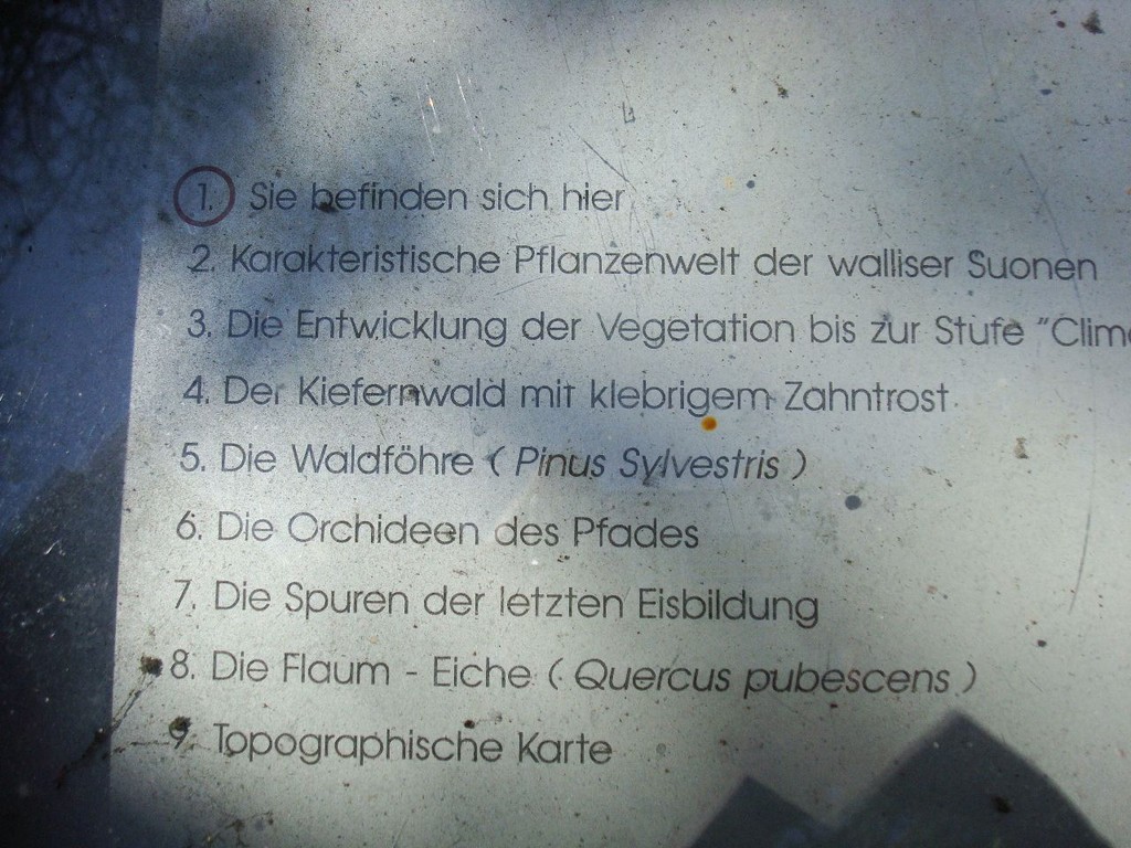 Der Weg führt grösstenteils durch lichte Föhrenwälder in einer Höhe von zirka 1000 m ü.M. Der Abstieg nach Varen am Schluss der Wanderung ist etwas steil, da heisst es gut aufpassen und auf den Weg schauen.