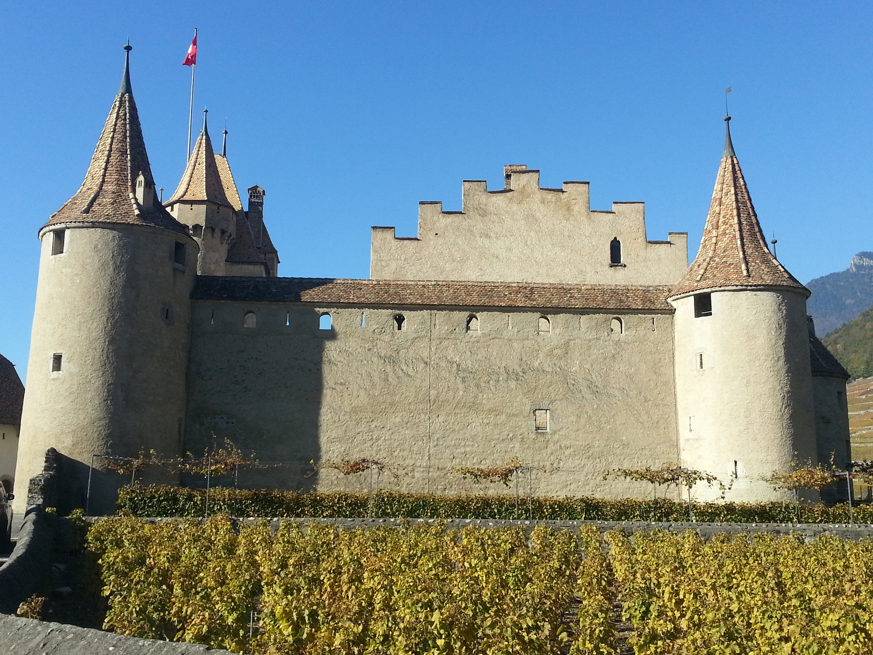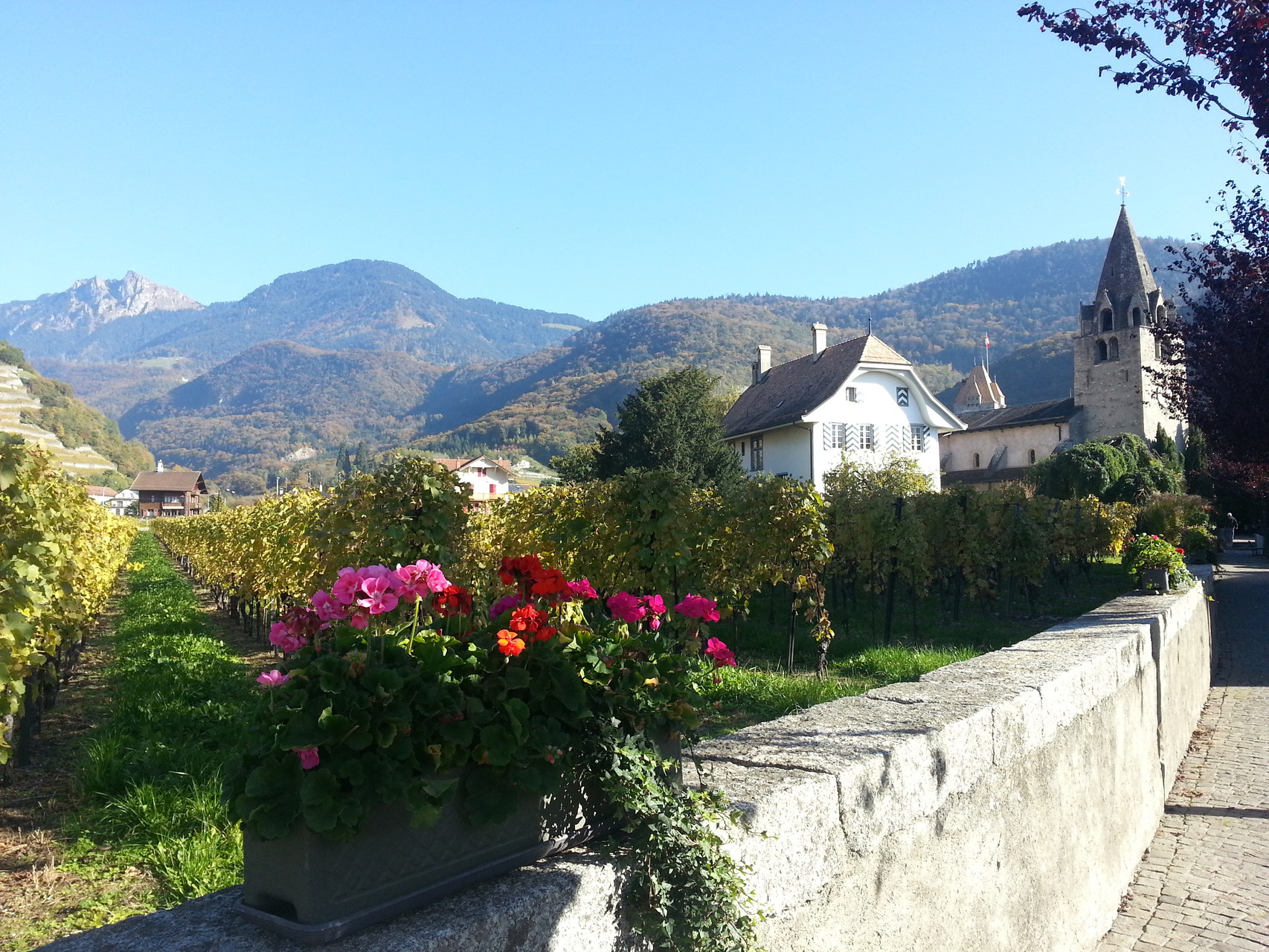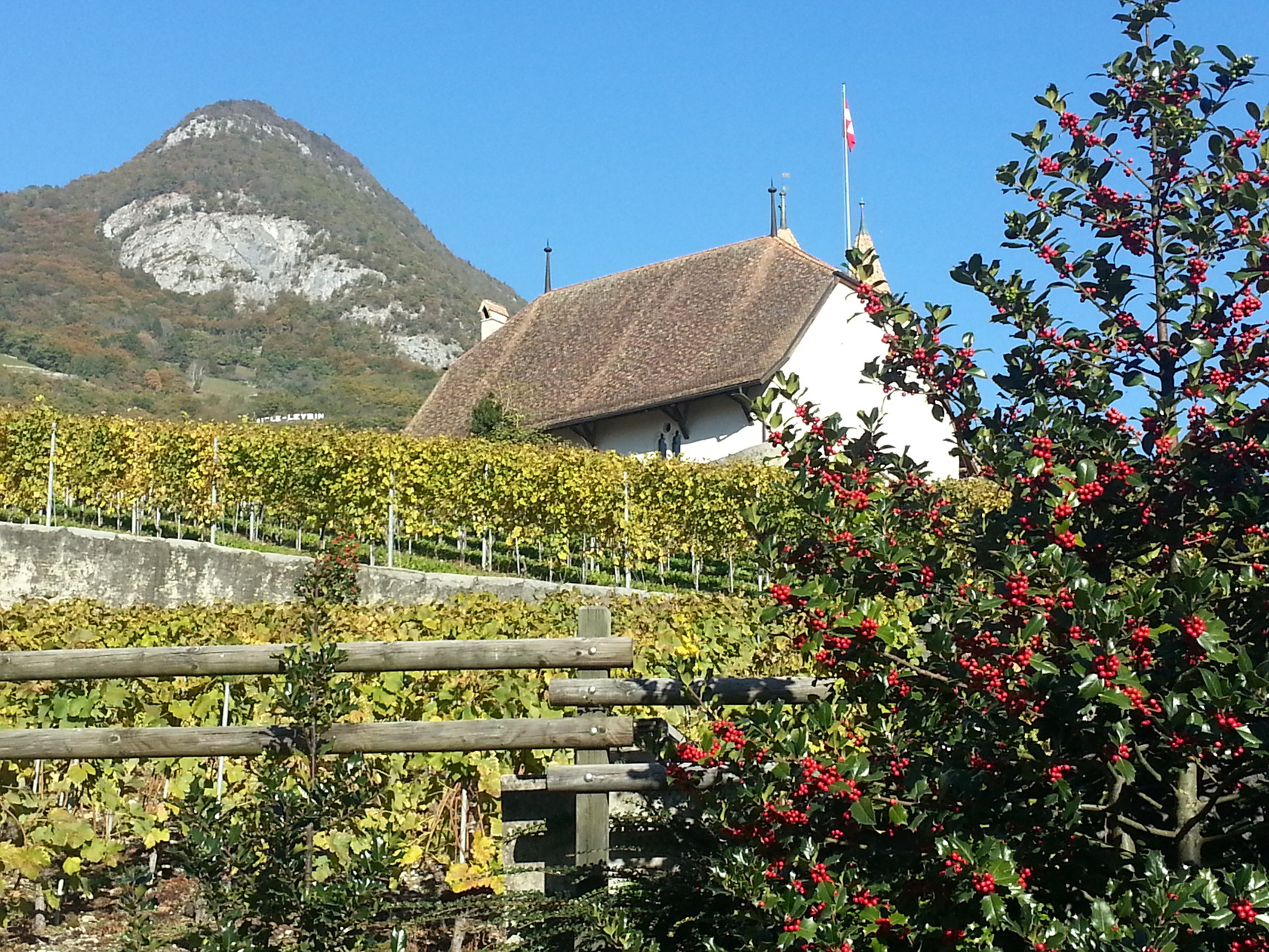 Herbstwanderung im Weinbaugebiet von Aigle (Tochter des Helios), eine der drei Töchter des Sonnengottes Helios und der Klymene. Als erstes machten wir eine kleine Streiftour durch die Stadt, an deren Rand wir das erste Mal auf den Fluss Le Grand Eau gestossen sind. Durch die weitläufigen Weinberge in der Umgebung konnten wir auf einen Feldweg durchqueren und sind bald in Yvorne eingetroffen. Der Gemeinde Yvorne ist eines der grössten Weinbaugebiete des Kantons zugeordnet. Der Wein ist bekannt im eigenen Land sowie über die Grenzen hinaus. Nachdem wir uns etwas umgeschaut hatten, haben wir den Weg Richtung Rhône eingeschlagen. Ein ganzes Stück konnten wir dabei wieder den Grand Eaus folgen, vorbei an Obstkulturen und mit Weitsicht zum Genfersee.