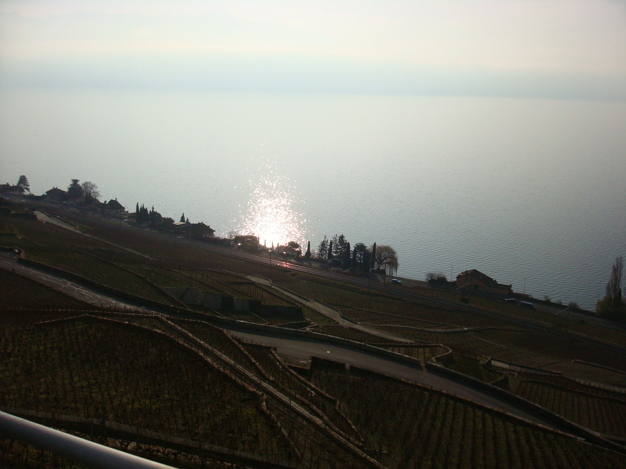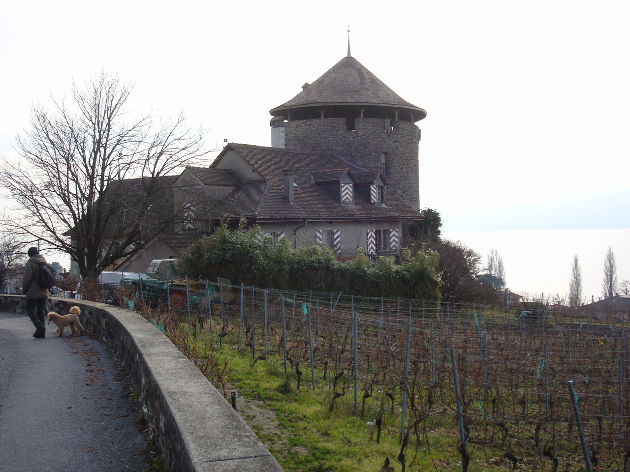 Wir passieren den Tour de Bertholod, einen burgähnlichen Bau aus dem 13. Jahrhundert und beobachten fünf Krähen im Tiefflug über den Reben – die wenigsten von ihnen sind mit Netzen vor den gierigen Schnäbeln geschützt. Vorbei geht es an Olivenbäumen und einigen Palmen, die für mediterranes Flair sorgen. Nach dem Örtchen Aran wandern wir ausnahmsweise nicht auf Teer, sondern auf einem Feldweg. Von hier aus bietet sich uns erstmals ein Panorama über den grünen Rebenteppich, der sich über die Hänge legt. Eingangs der nächsten Ortschaft Grandvaux wurde extra ein Parkhaus in den Hang hinein gebaut. Denn in den engen Gässchen des Winzerdorfes gibt es keinen Platz für die Autos. Das ist typisch für das Lavaux: Hier ist Dionysos, den Göttern des Weins. Alles muss sich dem Diktat der Reben unterordnen.